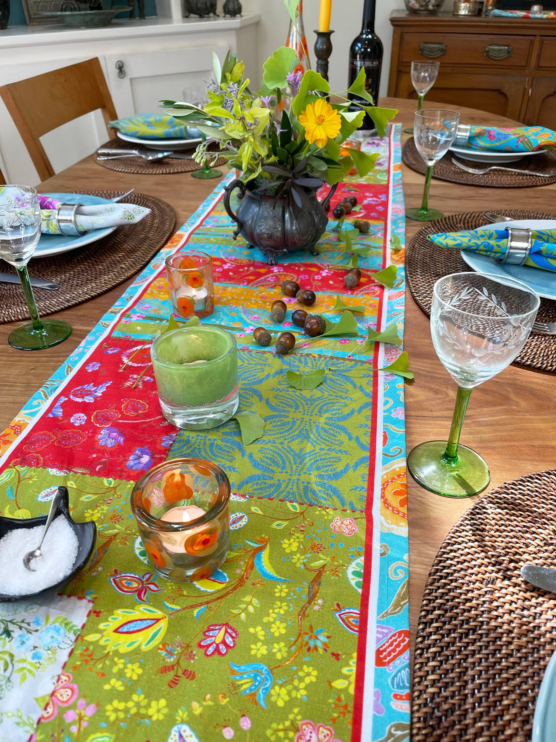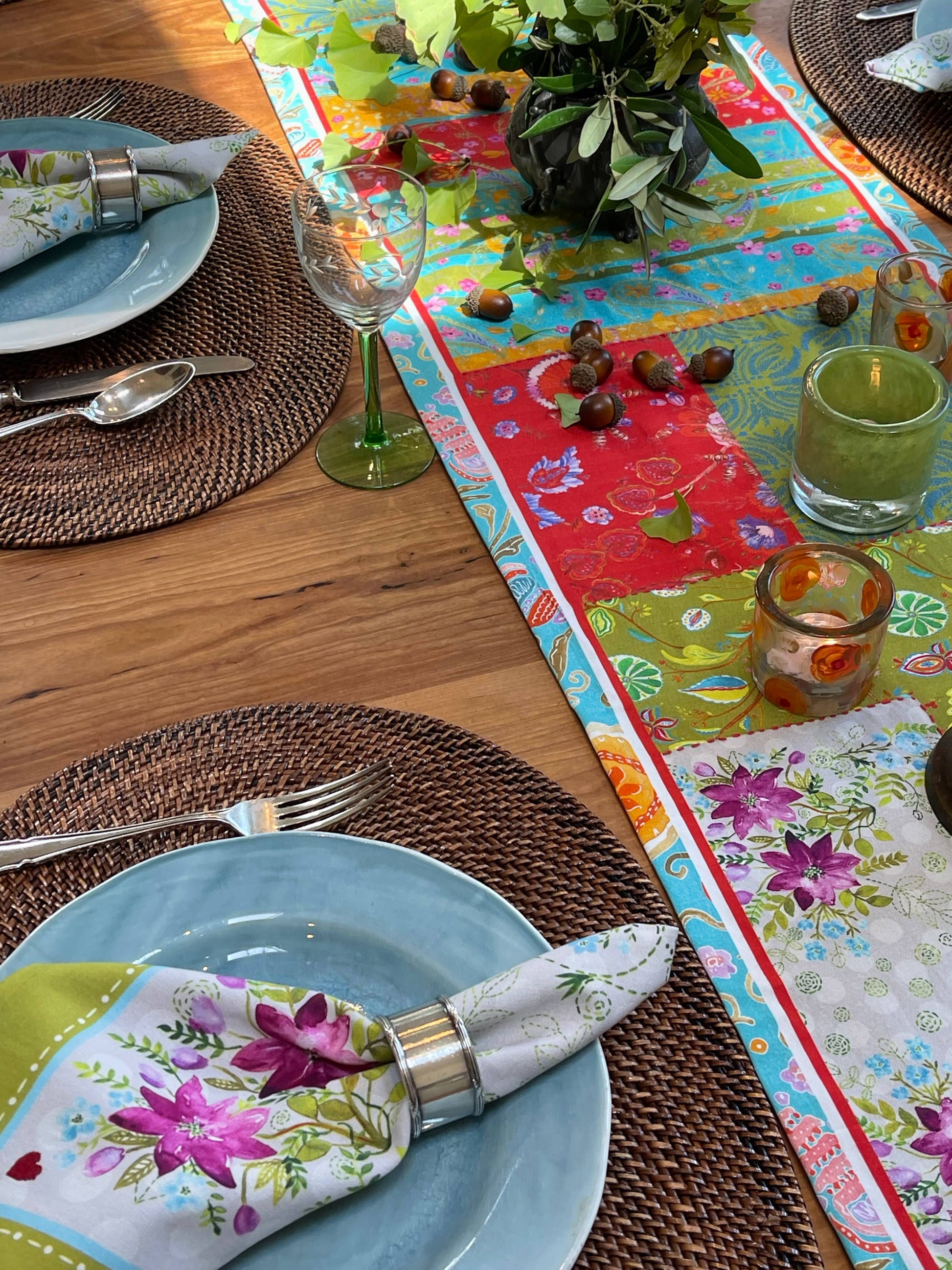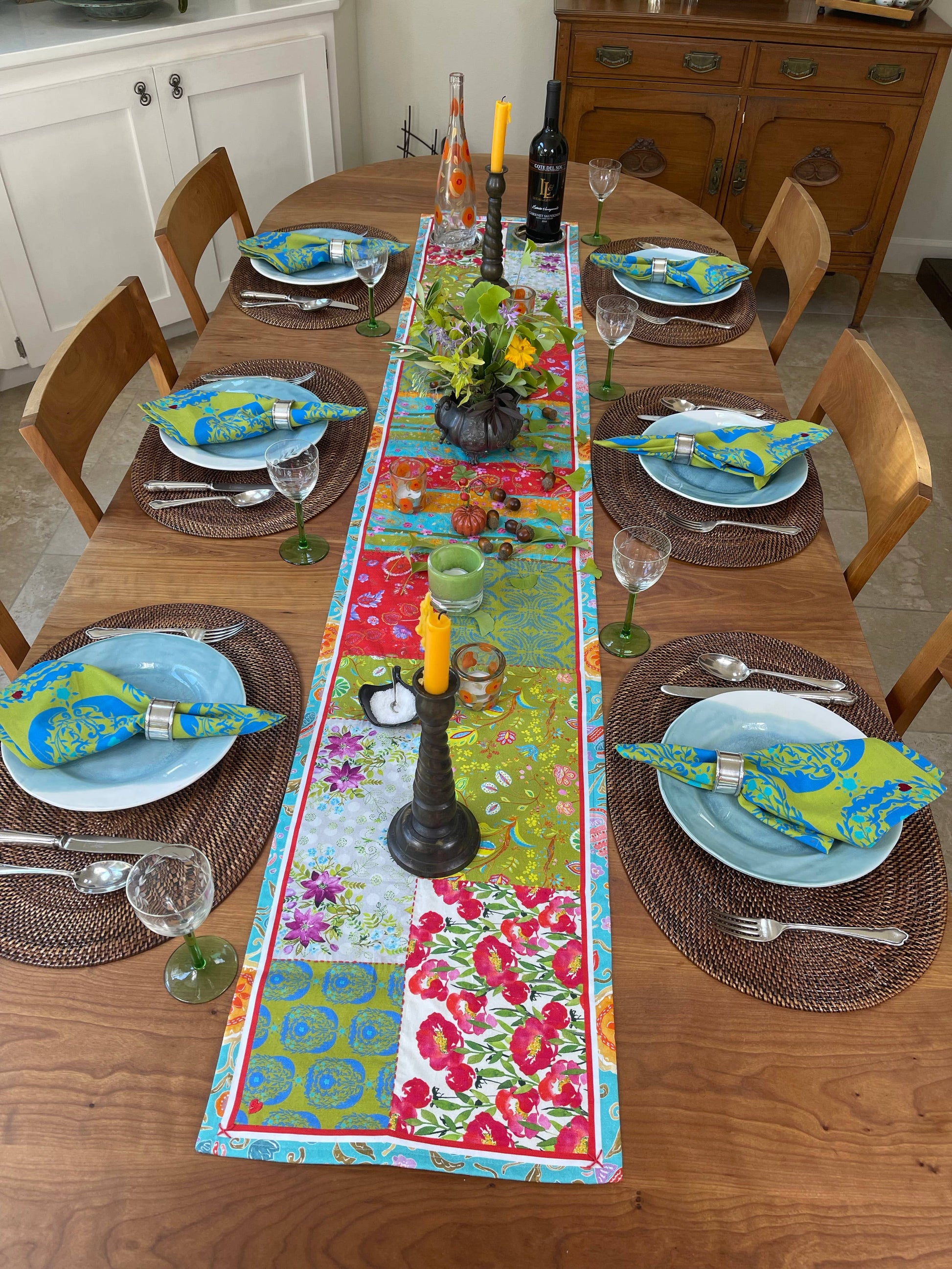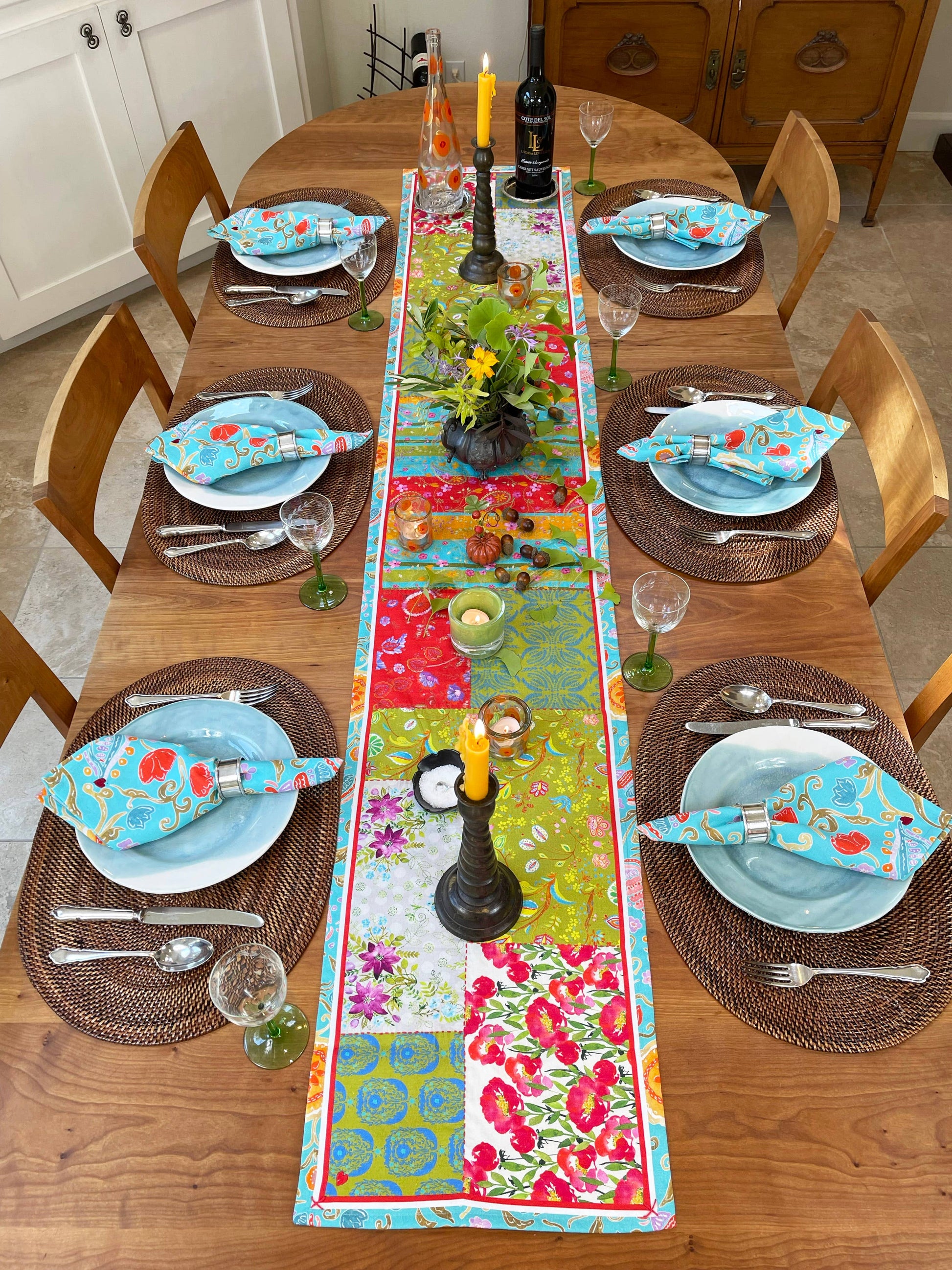 This runner can be used for multiple seasons depending on how you 'dress your table'. We show spring, Summer Fall and winter in the photos. Designed with a patchwork of prints (all also found in the "A Touch Of Love Napkin Collection"). The blend of vibrant and more subdued colors allows you to choose the season you want to emphasize. Pick up the darker colors for fall and winter or the brights for spring and summer. A Touch of Love gives a table a sophisticated eclectic feel while still feeling warm and homey. You can add a mix of napkins from the collection or pick one design. The reverse of the runner is solid green with a wrap around from the front. An embroidered running stitch divides the designs, a kiss (embroidered X)is in each corner and an embroidered heart in one corner. Beautifully made with certified organic cotton. Approx 82" x 14"
