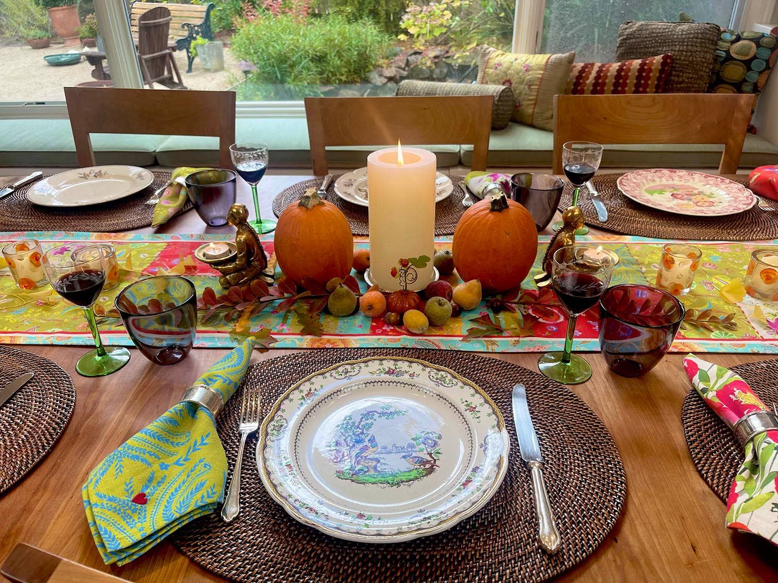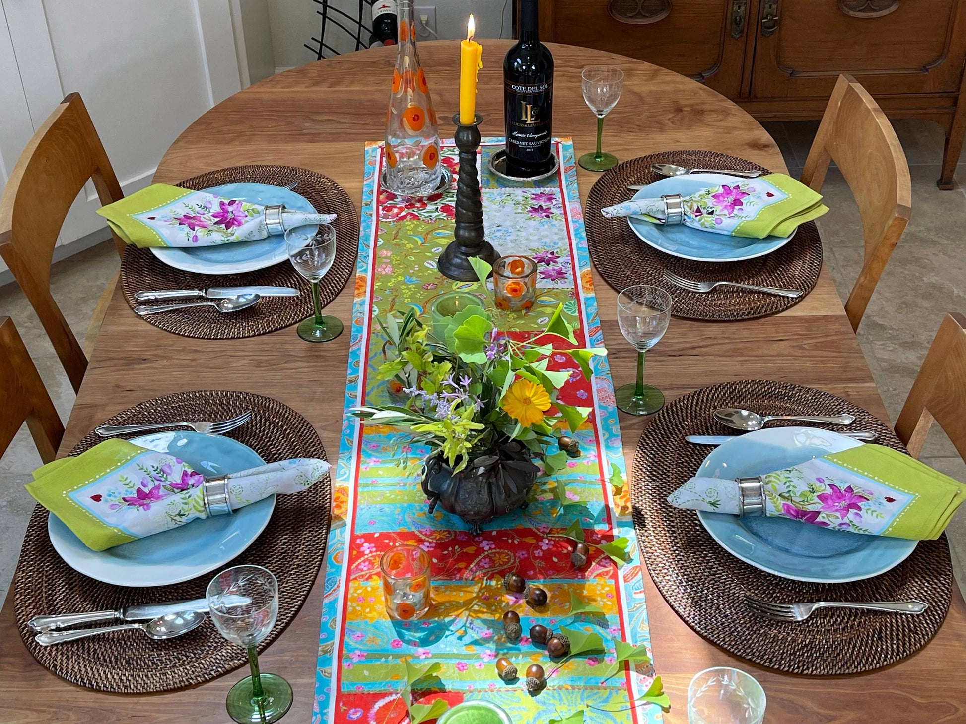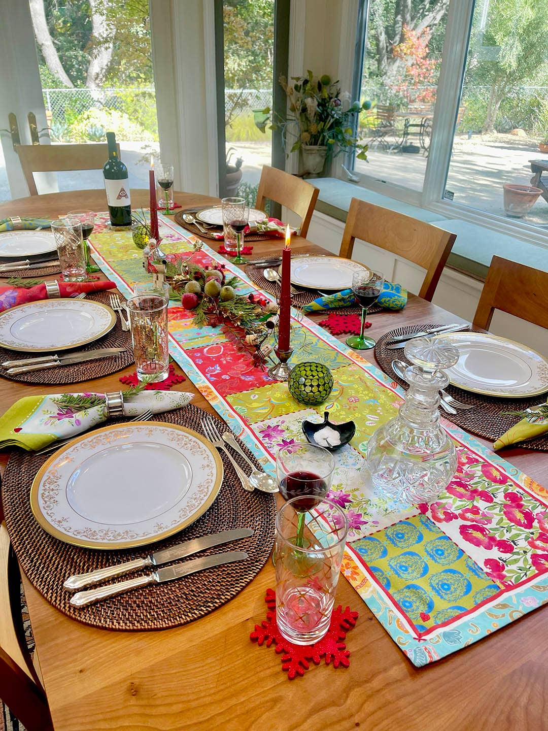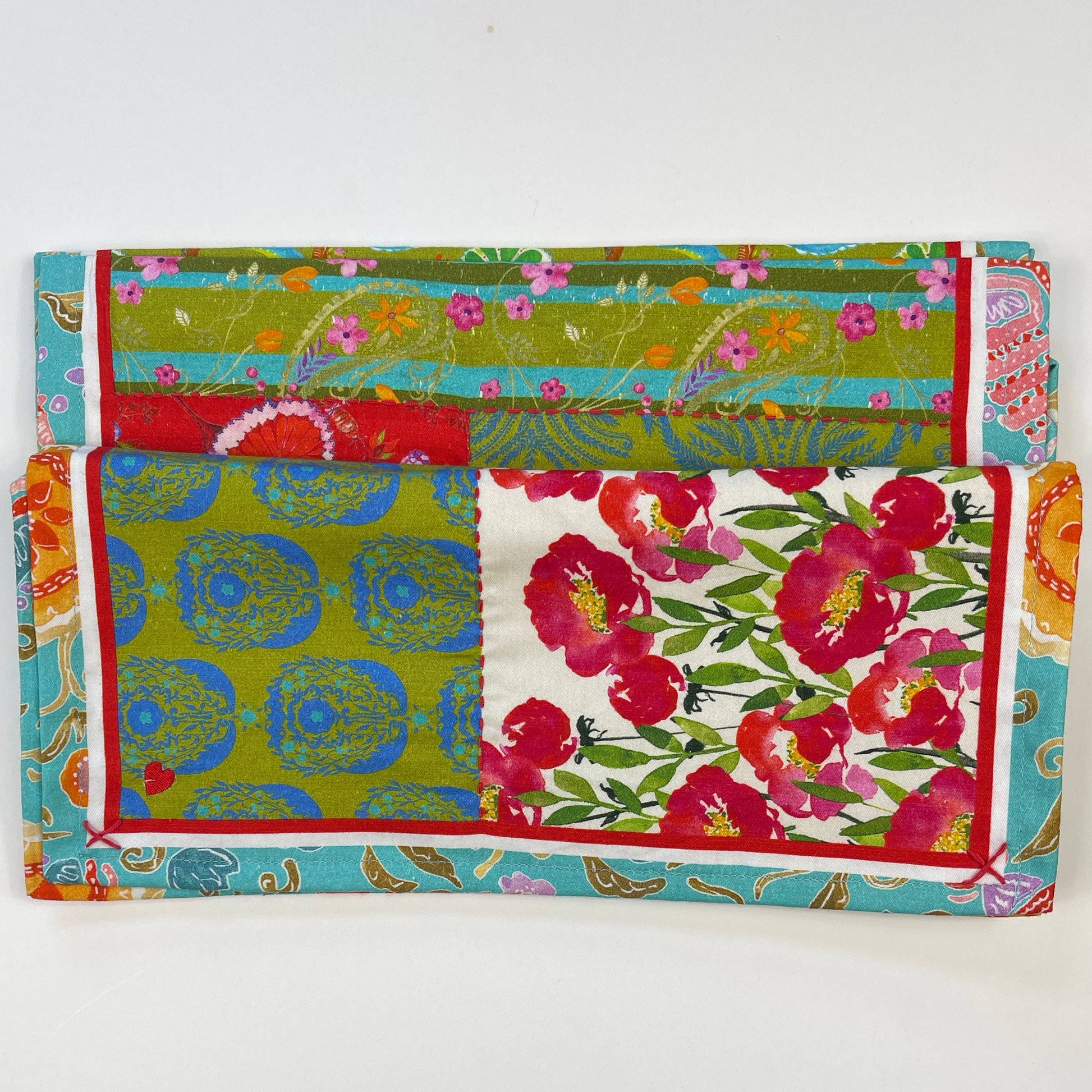This runner can be used for multiple seasons depending on how you 'dress your table'. We show spring, Summer Fall and winter in the photos. Designed with a patchwork of prints (all also found in the "A Touch Of Love Napkin Collection"). The blend of vibrant and more subdued colors allows you to choose the season you want to emphasize. Pick up the darker colors for fall and winter or the brights for spring and summer. A Touch of Love gives a table a sophisticated eclectic feel while still feeling warm and homey. You can add a mix of napkins from the collection or pick one design. The reverse of the runner is solid green with a wrap around from the front. An embroidered running stitch divides the designs, a kiss (embroidered X)is in each corner and an embroidered heart in one corner. Beautifully made with certified organic cotton. Approx 82" x 14"