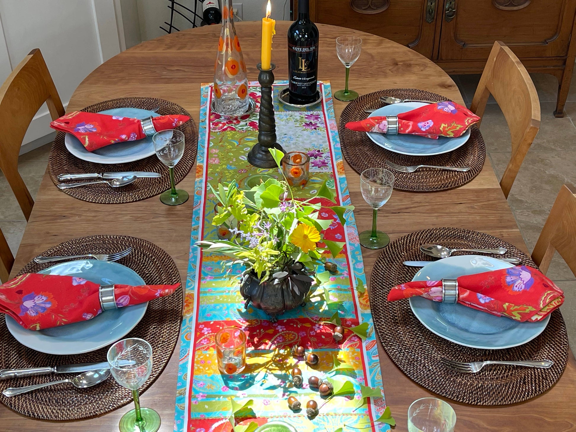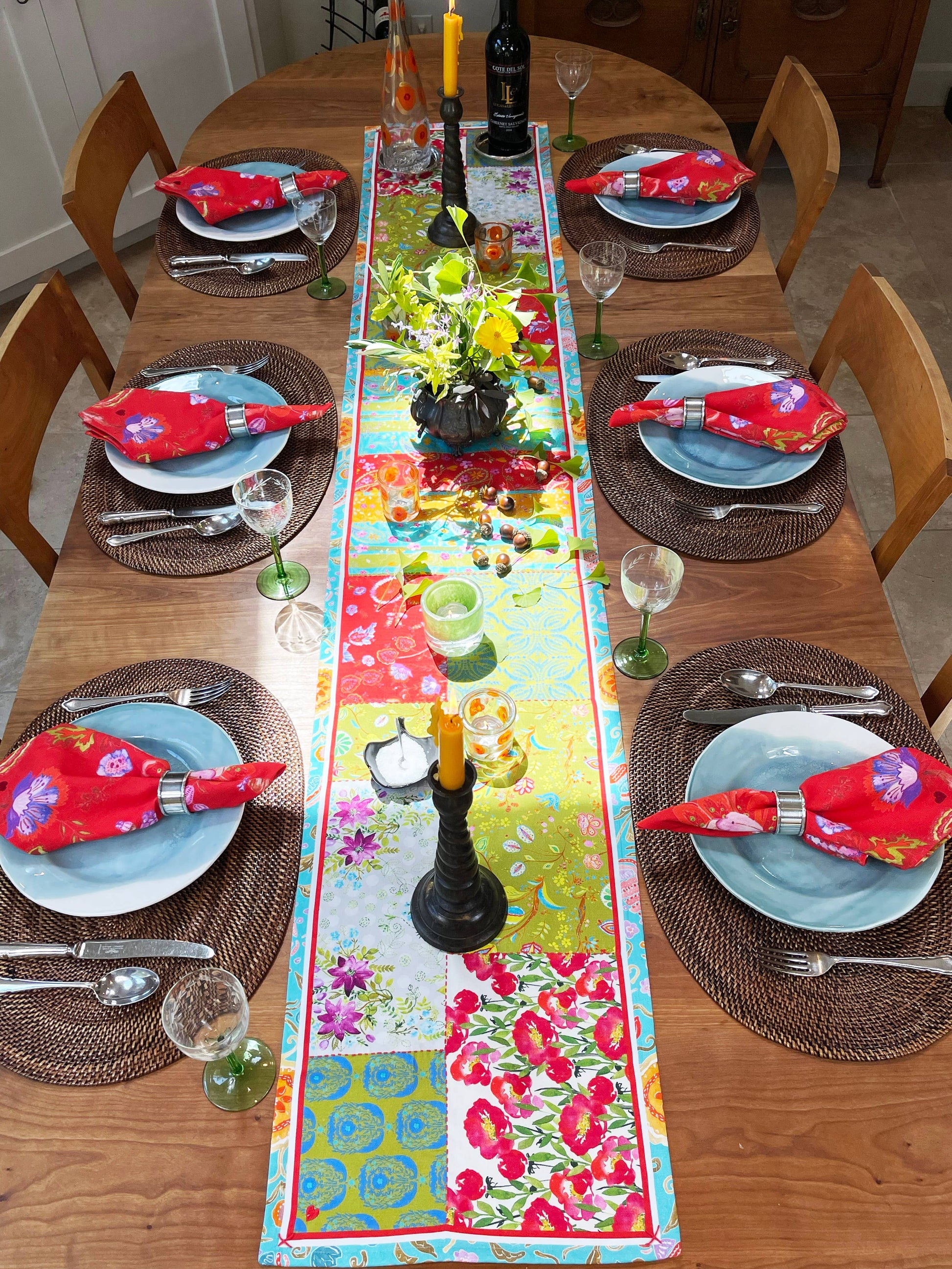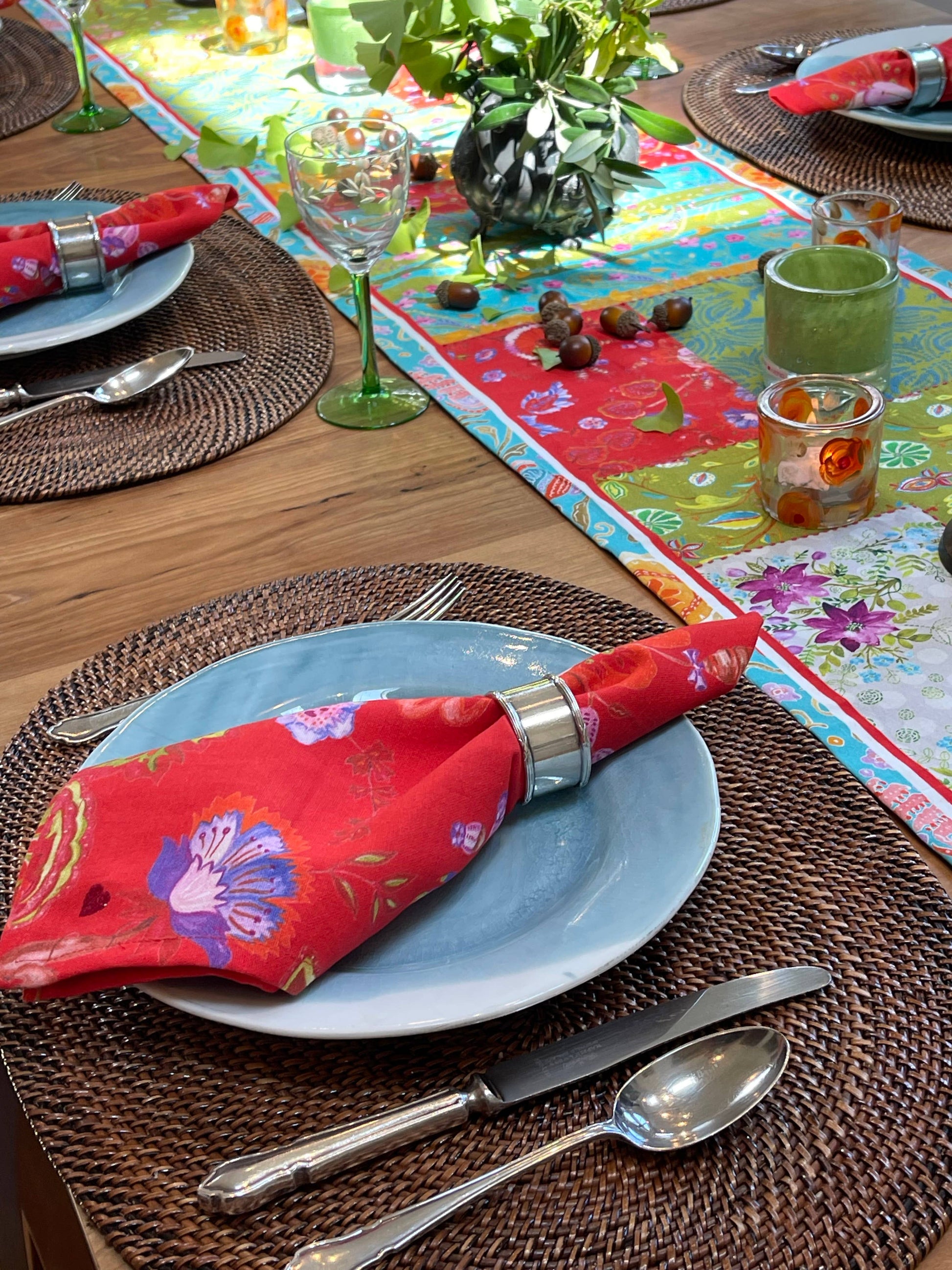 Anima is a design that feels fun and fresh. The icons are a stylized Jacobean design. Pair it with our Touch of Love Runner. The colors are a deep engine red, coral, olive green with touches of blues and lavenders. A beautifully embroidered heart is on one corner to remind us that it's all about the touches of love we bring to the world! Organic cotton, mitered corners 20" x 20" Mitered corners