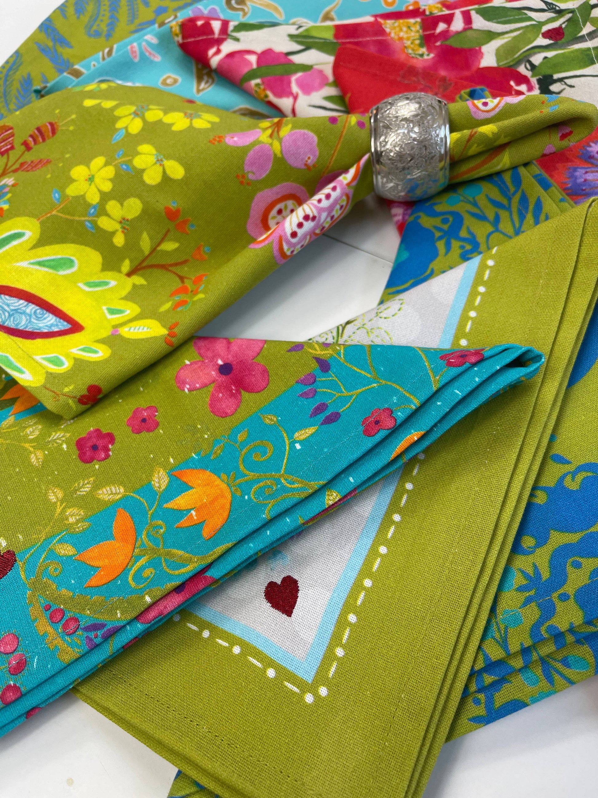 Transformation is a fun and fresh design inspired by paisley. The icons are painted in a loose style and then mirrored giving a modern edge to a classic icon. Pair it with our Touch of Love Runner. The colors are red, greens, aqua, orange, lavender and pink. A beautifully embroidered heart is on one corner to remind us that it's all about the touches of love we bring to the world! Organic cotton, mitered corners 20" x 20" Mitered corners Mix and match napkins are available in different designs