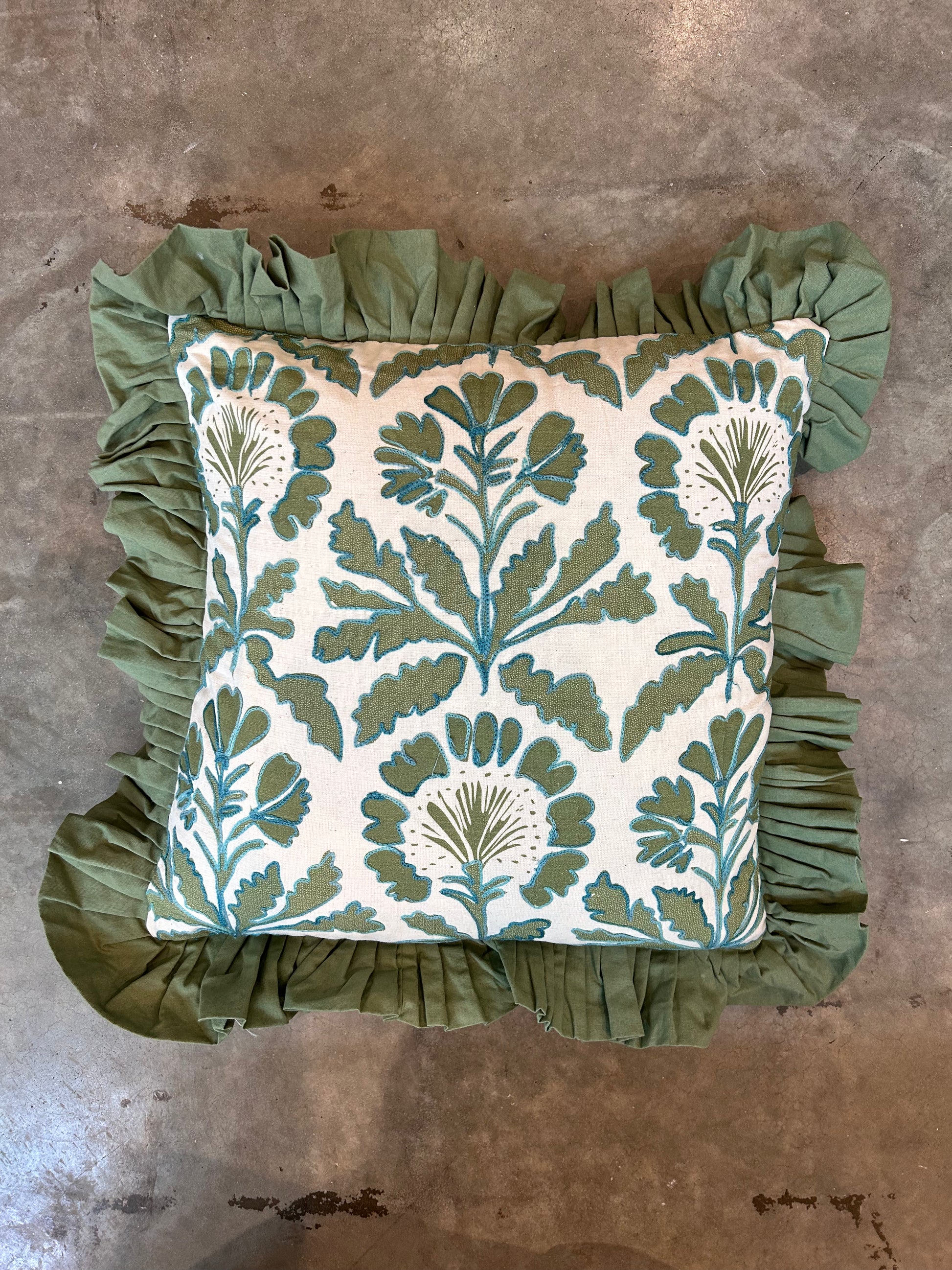 Get this decorative Square Pillow with Floral, Embroidery and Ruffle pillow! Featuring a zipper back, and neutral background yet vibrant green front, give your room a bit more comfort!