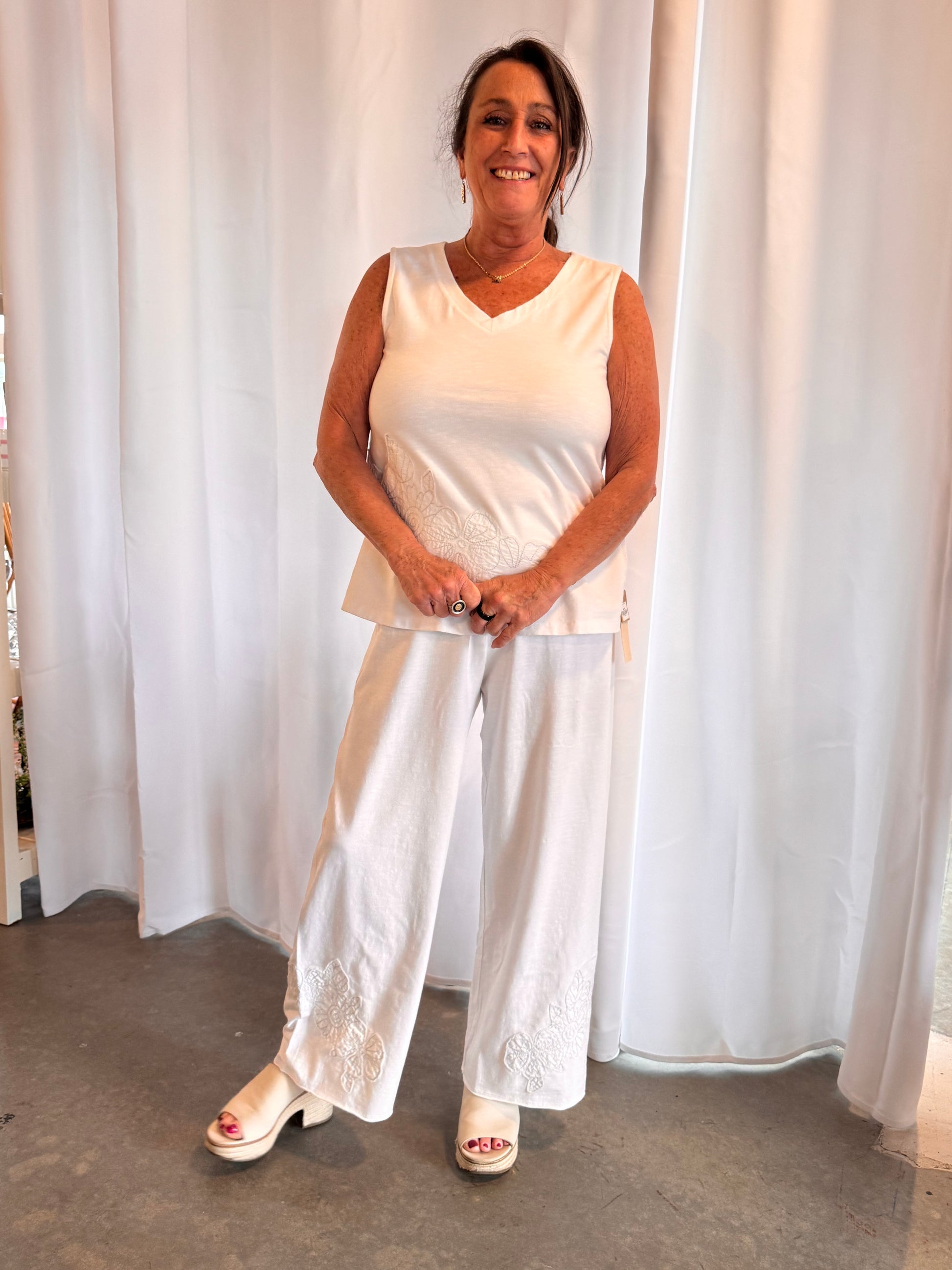 Crafted from a breathable spandex and cotton blend, these flood pants feature an eye-catching embroidered leg pattern that adds visual interest to your everyday wardrobe. The stretchy fabric moves with you, delivering a snug, flattering fit that's comfortable enough for all-day wear. Perfect for casual outings or relaxed styling.