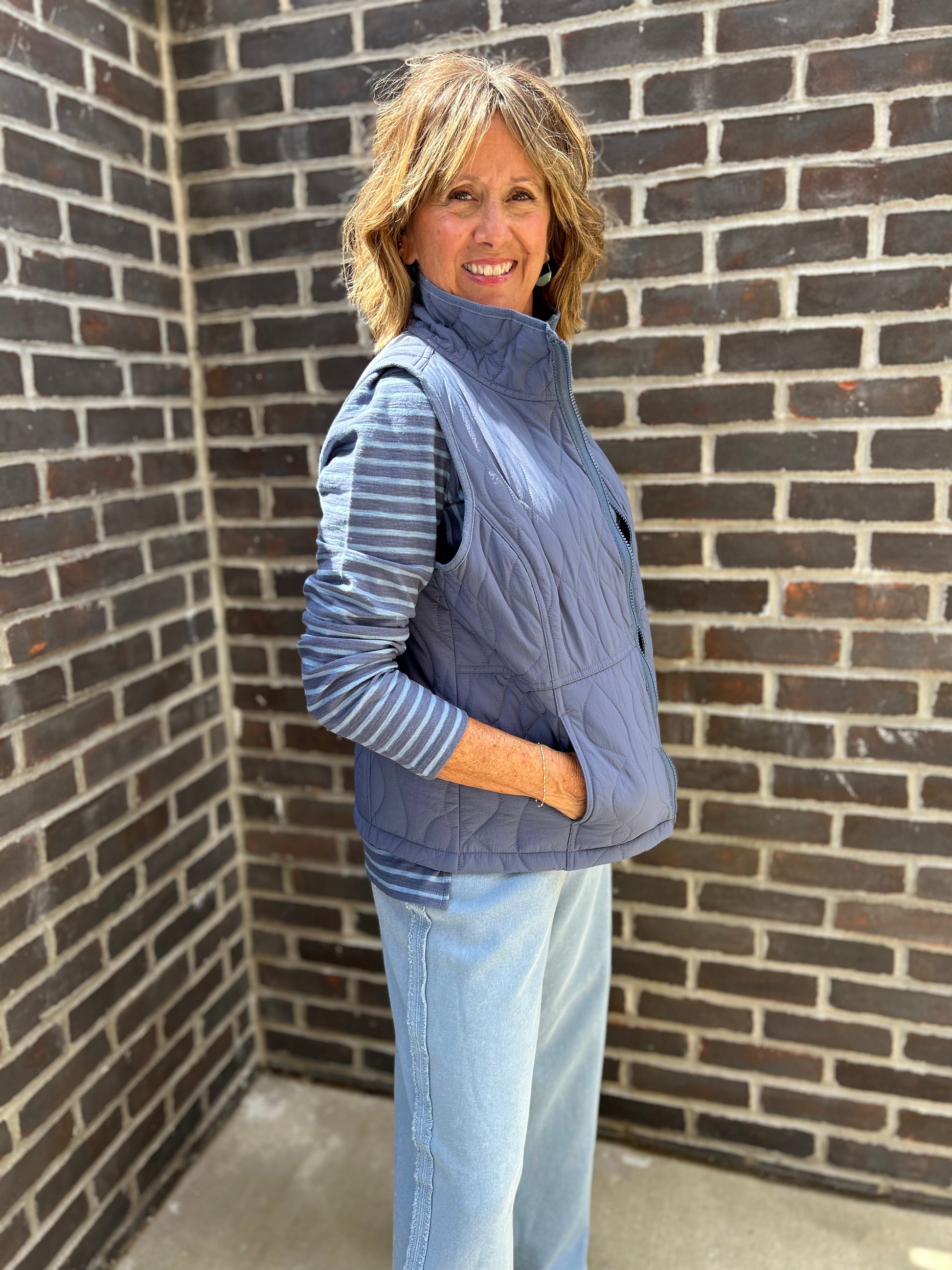 Sporty, quilted fabric vest with stand up collar and front slash pockets. Front and back seams and zipper front.