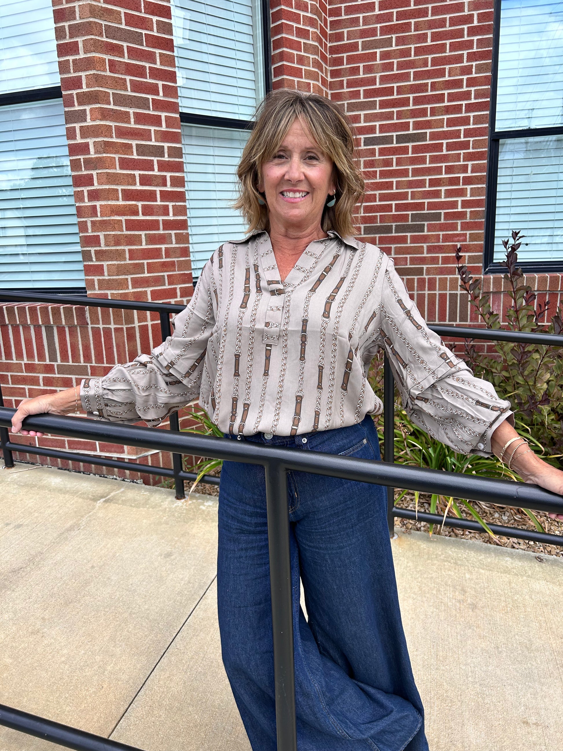 Stunning buttonless blouse has blousy sleeves with pleats and has side pockets.