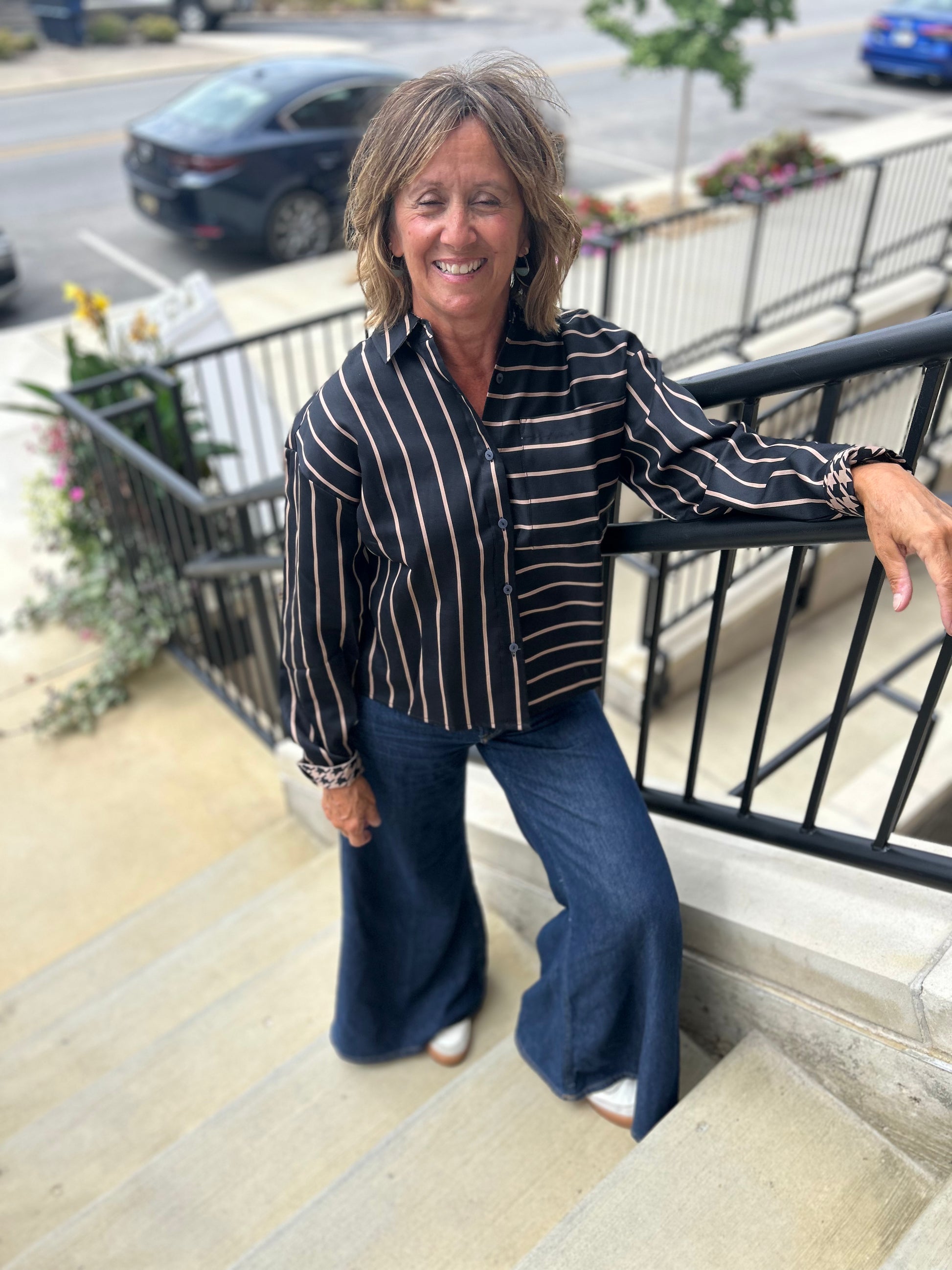 Cropped brown and black blouse has opposing stripes and large breast pocket. Contrasting cuffs and collar. all cotton. easy care: no ironing