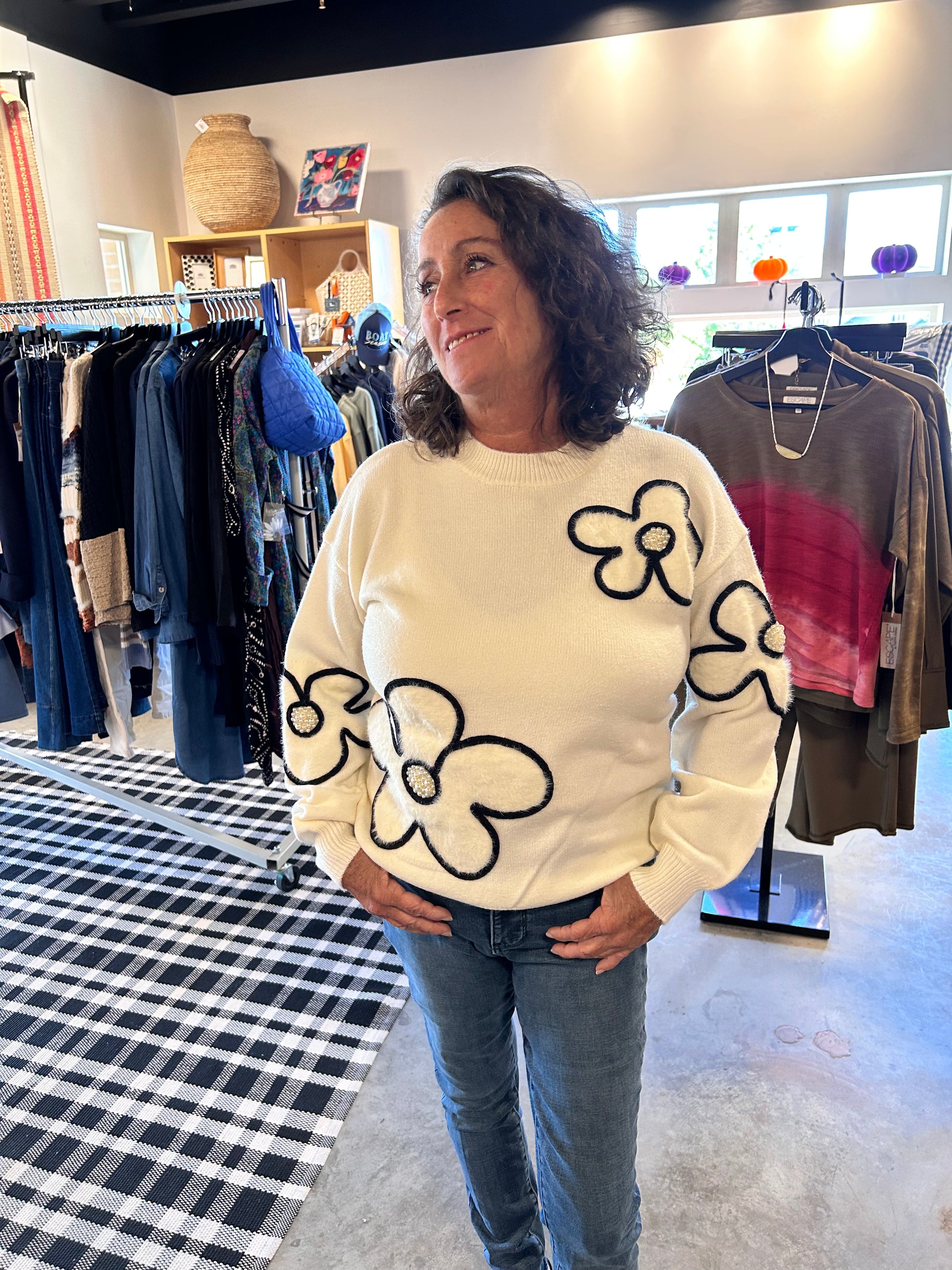 Beautiful cream sweater with detailed flowers. Flowers are outlined in black with a furry inside and beaded center. Made of acyrlic, poly idea and polyester.