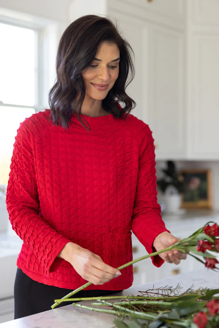 Mock neck, raglan sleeves and fun patch pockets bring life to a truly unequal fabric.