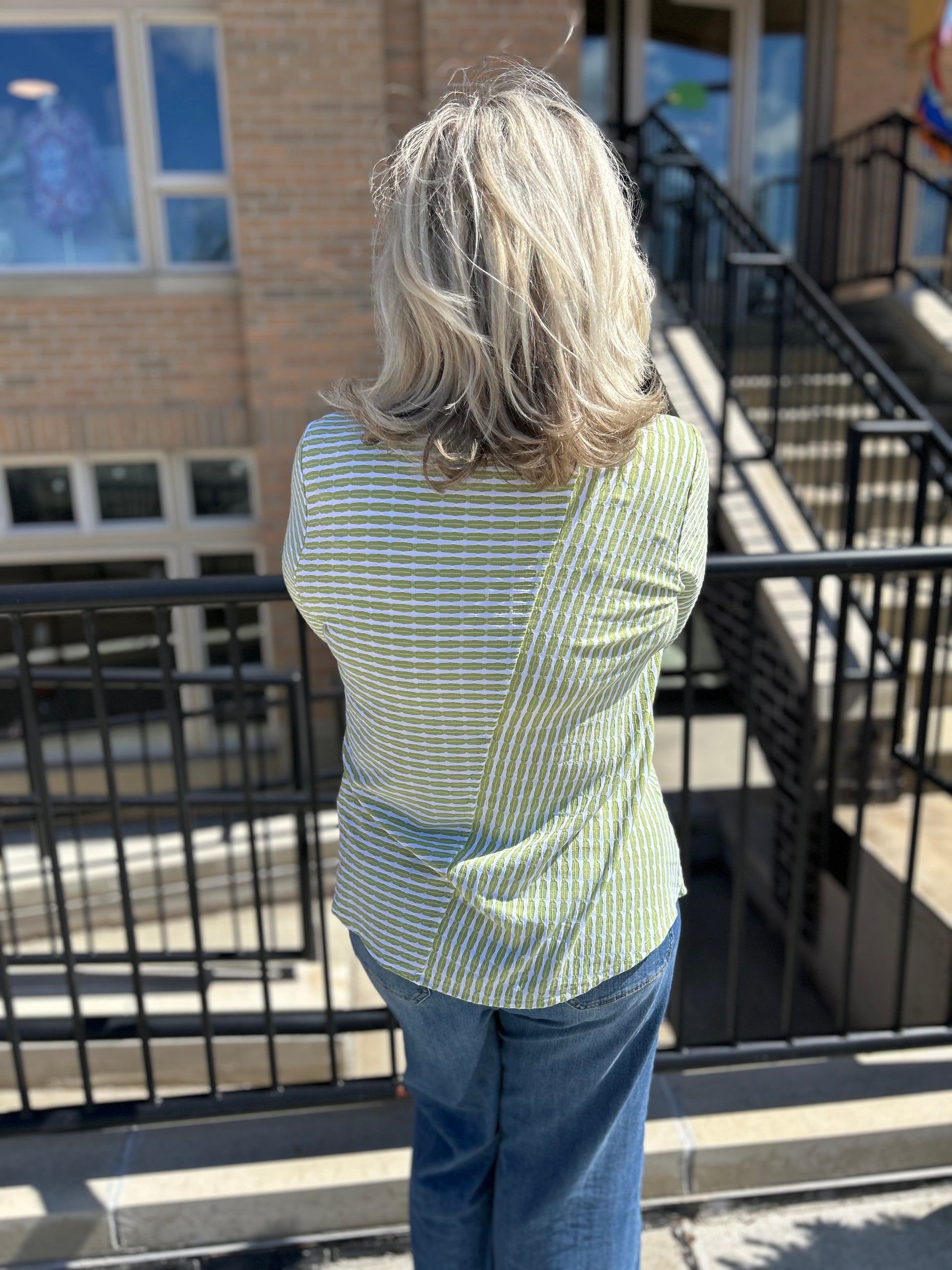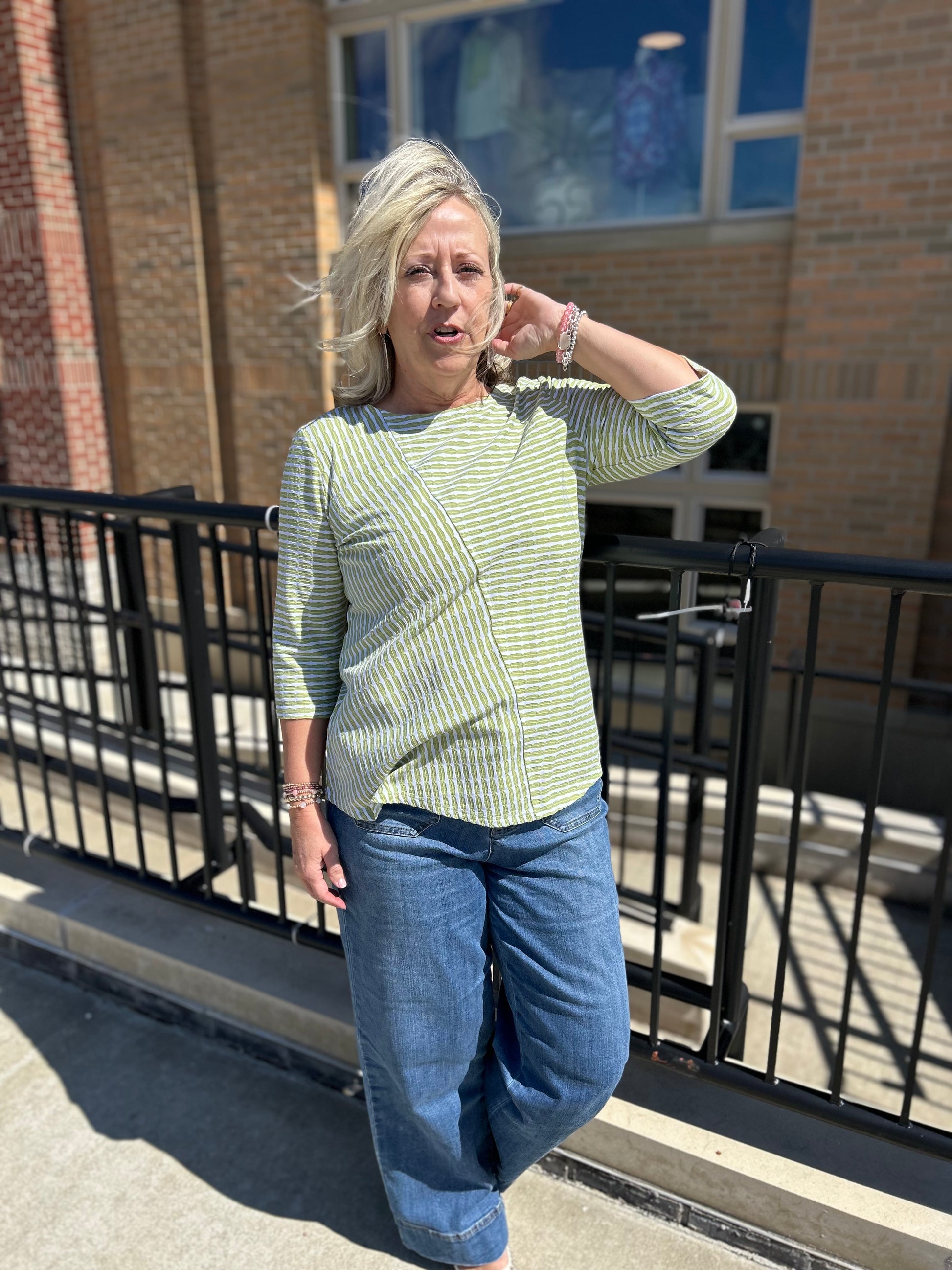 3/4 sleeve top, a-line hem with contrasting stripe pattern on front and back. 55% rayon, 43% polyester, 2% spandex.