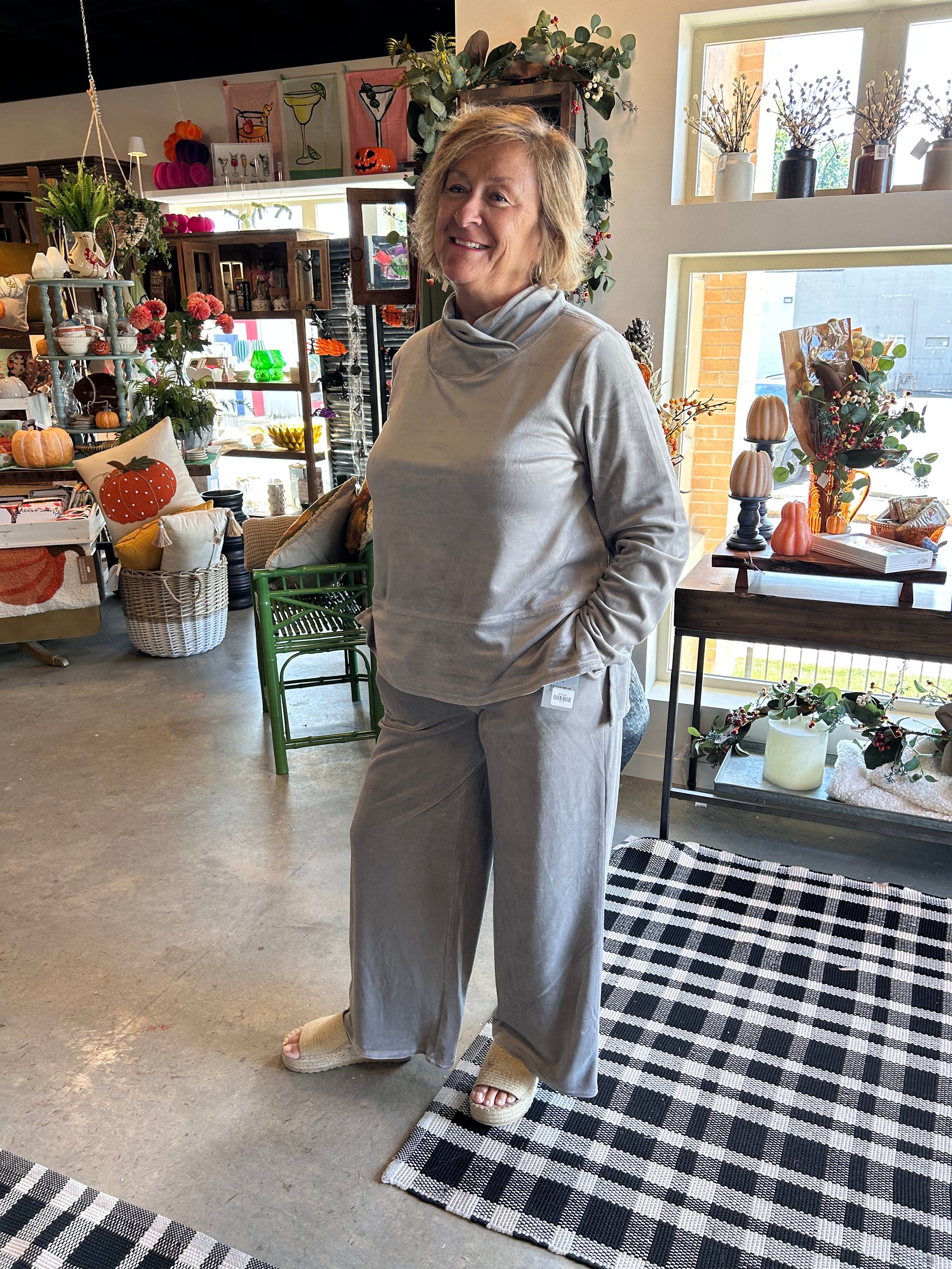 Cozy, soft velour type fabric pants with elastic waist and side pockets. Wide leg.