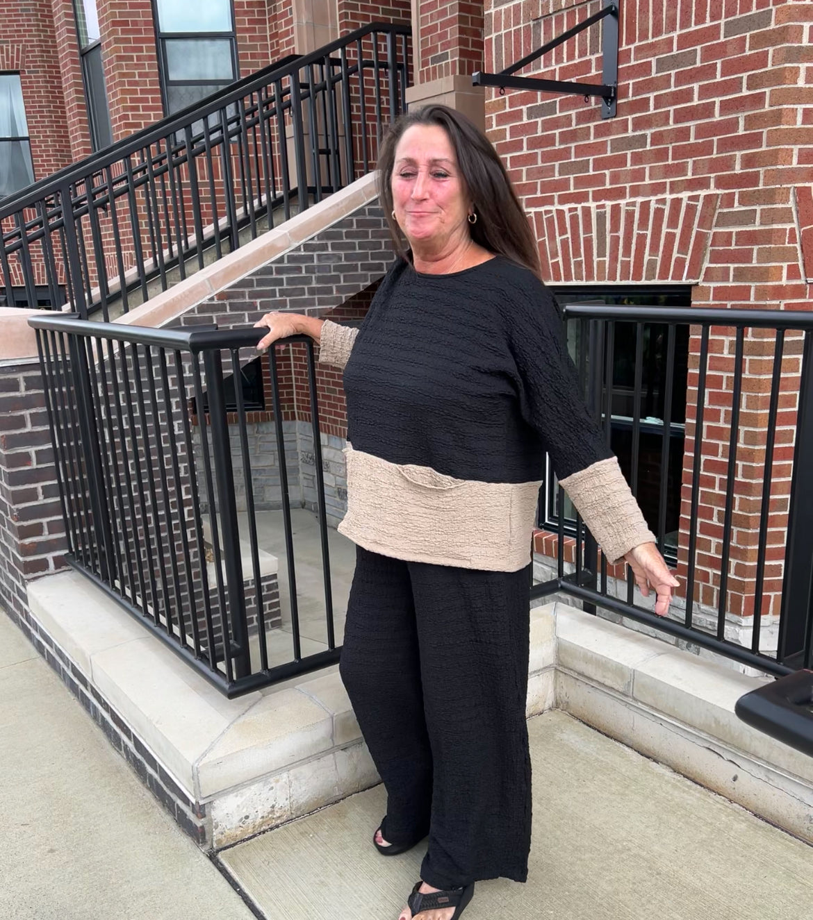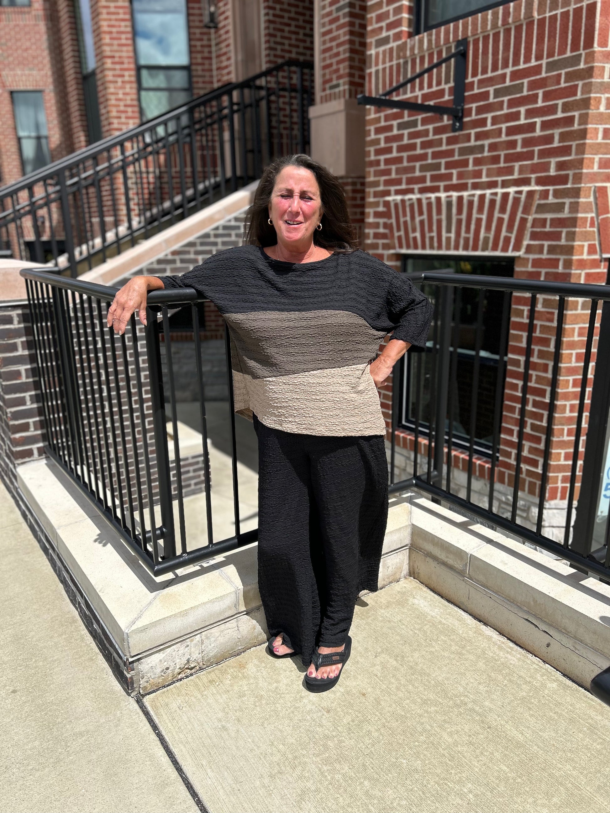 Lightweight pucker fabric comes in 3 colors: tan (brown), olive and black. Combinations shown below. Runs a little oversized.