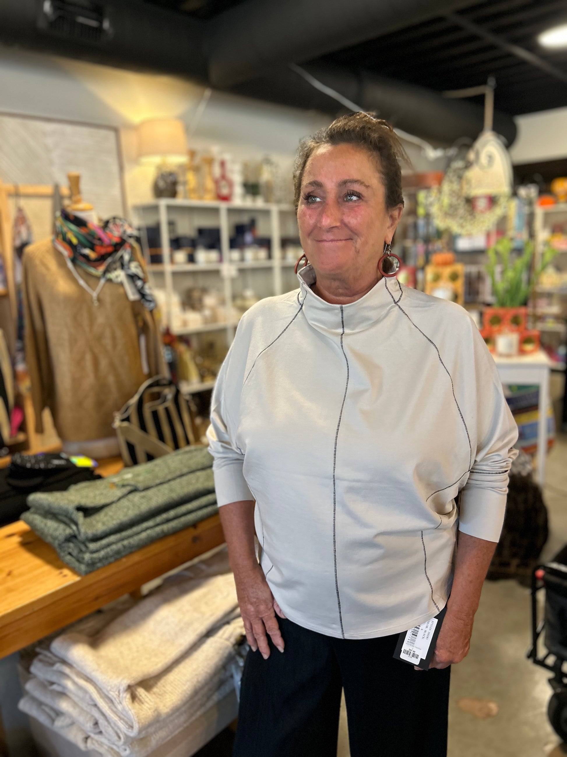 Very flattering cream top has black contrasting stitching, mock neck. cotton/modal/spandex
