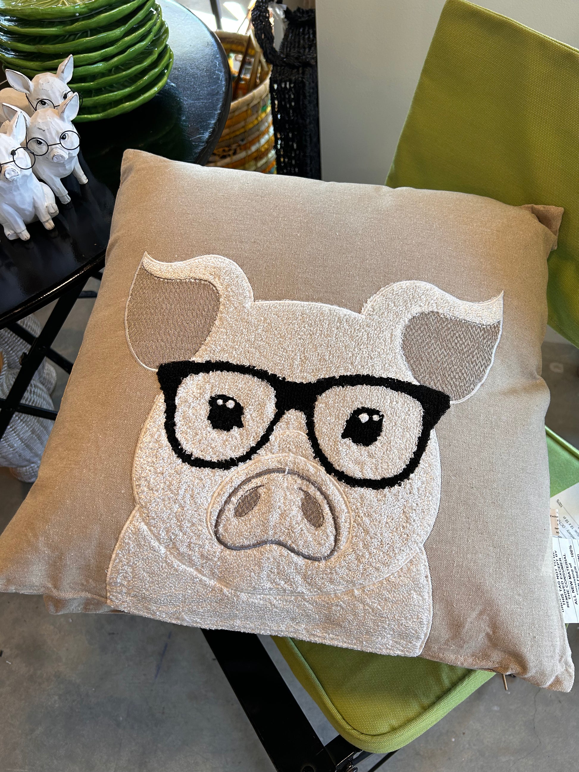 This embroidered piggy pillow with glasses, bring a smile to your room. 18”