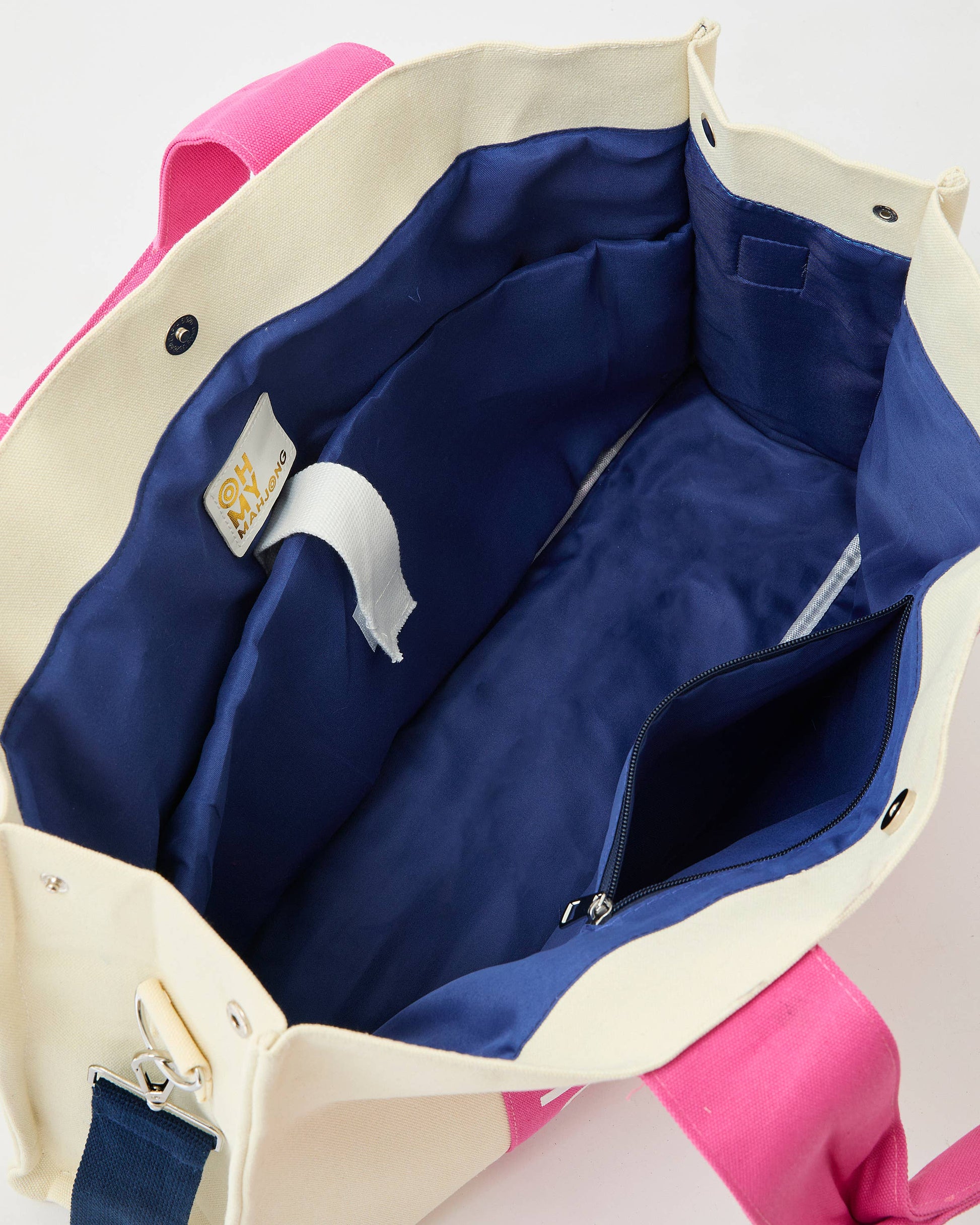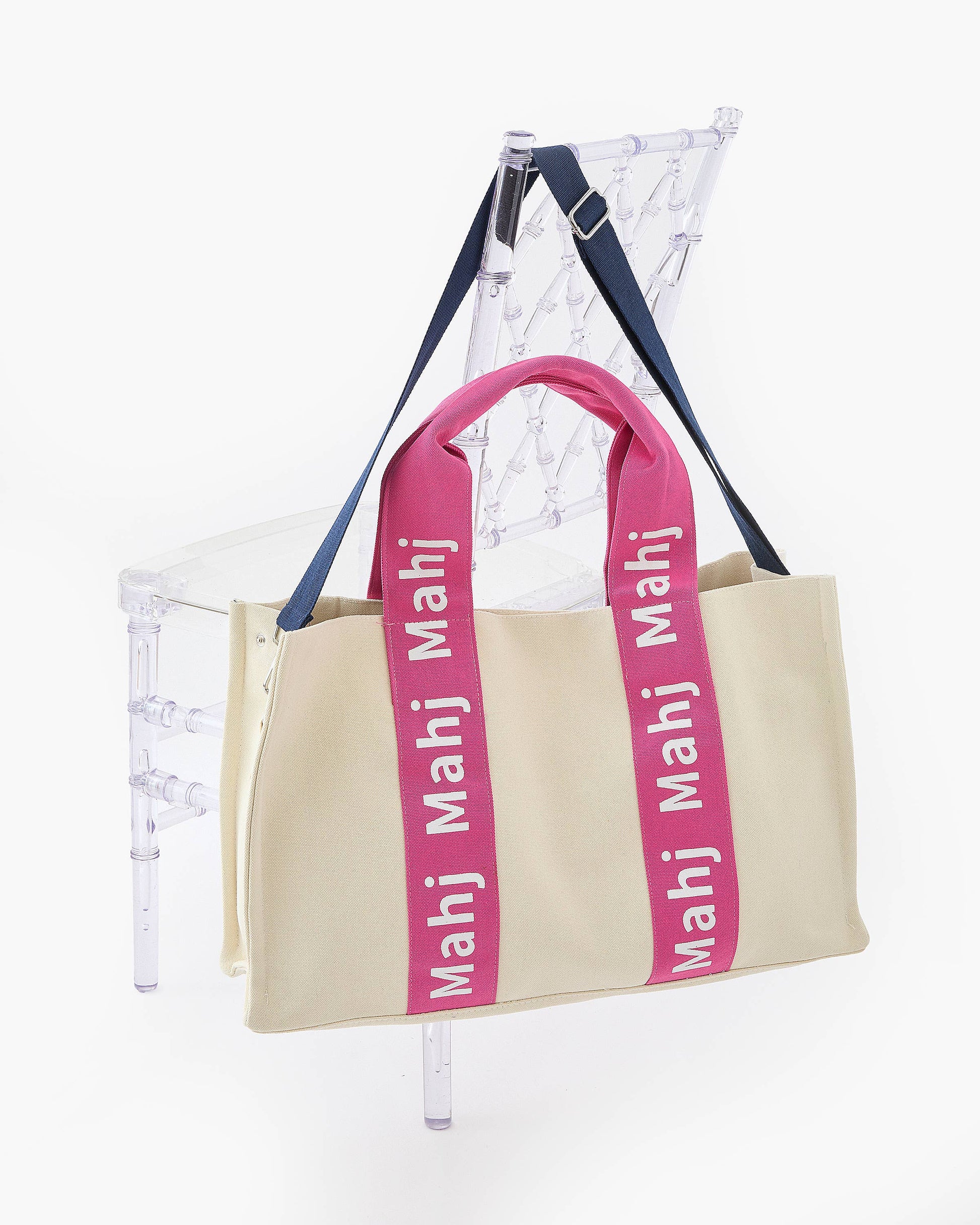 Introducing the Mahj-It-All Bag in a captivating pink! Lined with a bold navy interior, this refreshed canvas storage companion is designed to bring a smile to your face. Not only does it elevate your Mahjong gaming experience, but it also doubles as a fantastic work bag.