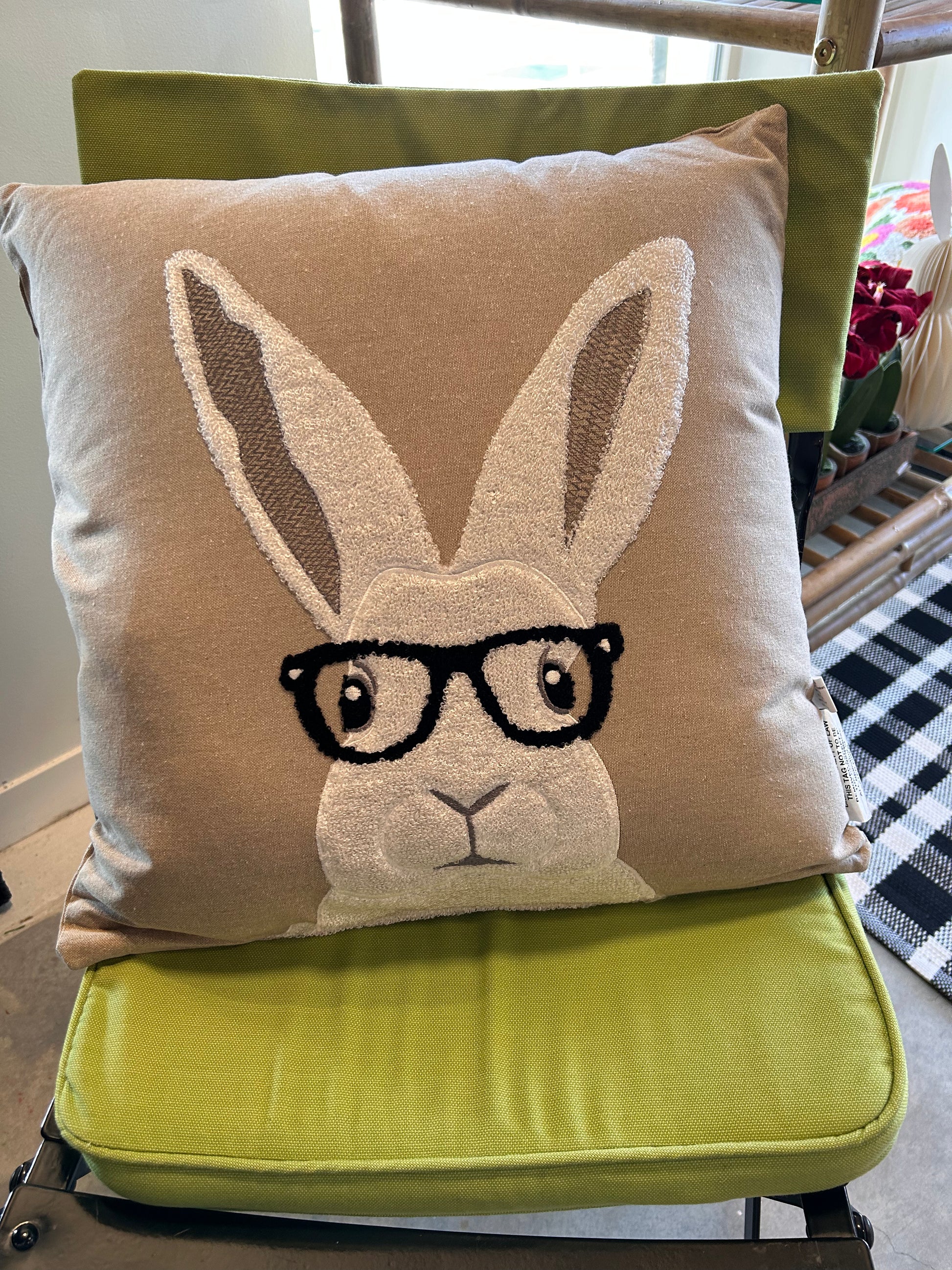 Embroidered bunny with glasses pillow on neutral cotton background. 18 inches. Not just for Easter.