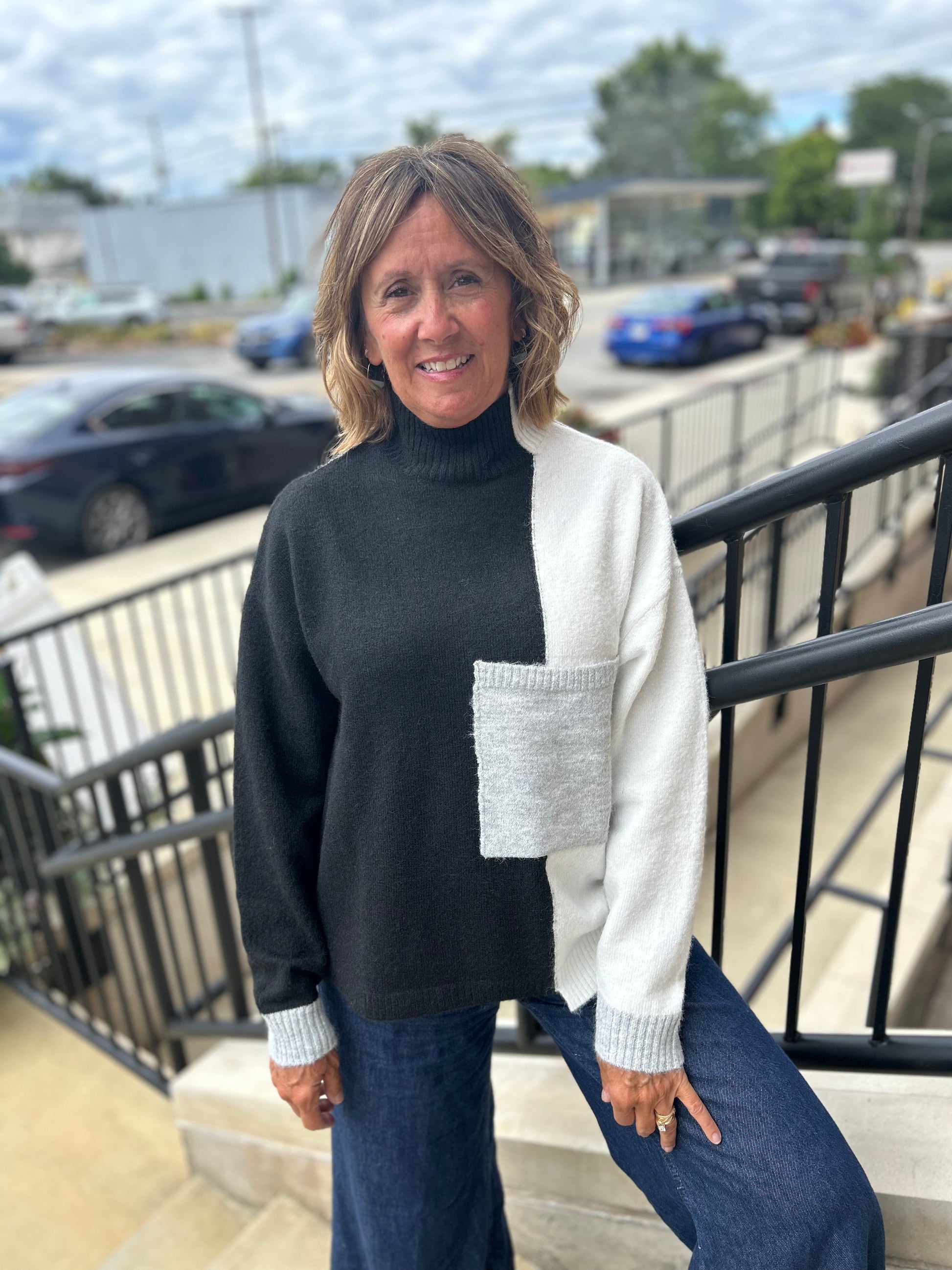Super soft and cozy sweater with color blocked pattern. Large front pocket. Mock neck.