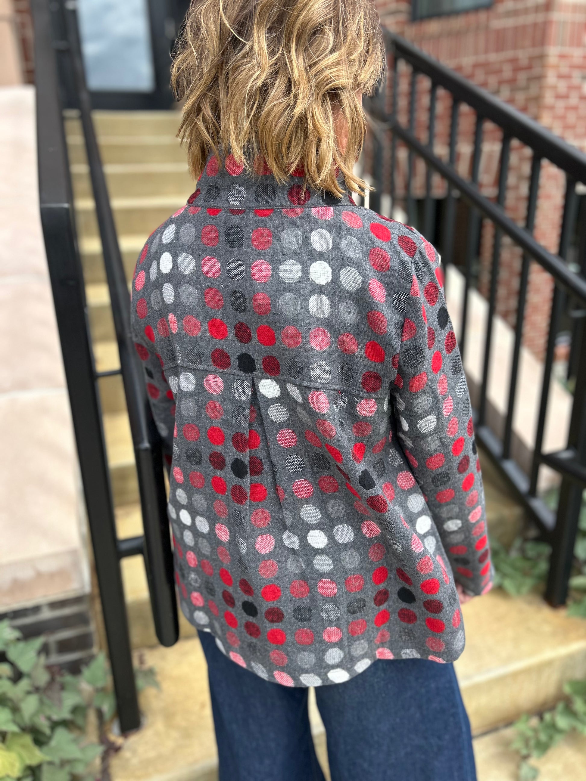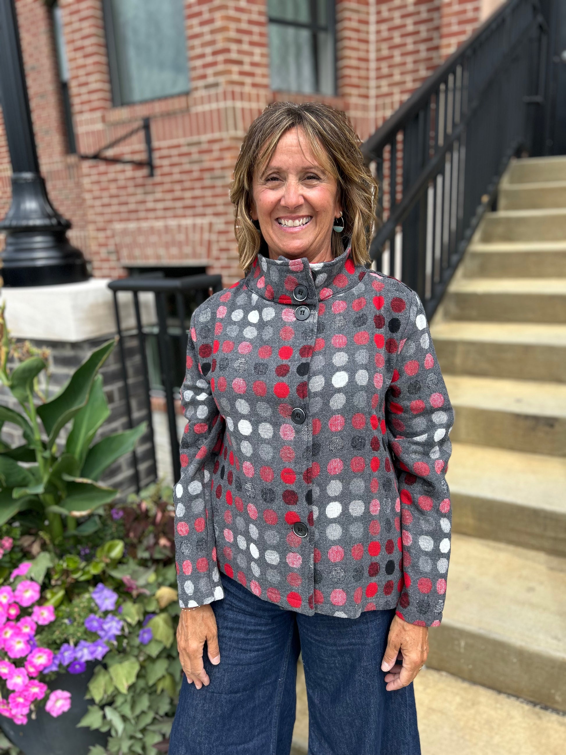 Grey jacket with multi-dots. Tab button collar with button front. A-line styling and side pockets. Back dart.