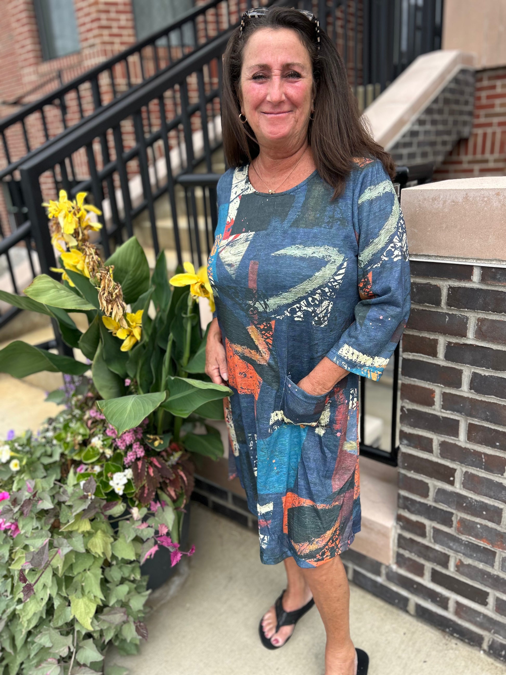 Colorful casual dress with 3/4 sleeves and one front pocket. Round neck. Lined.