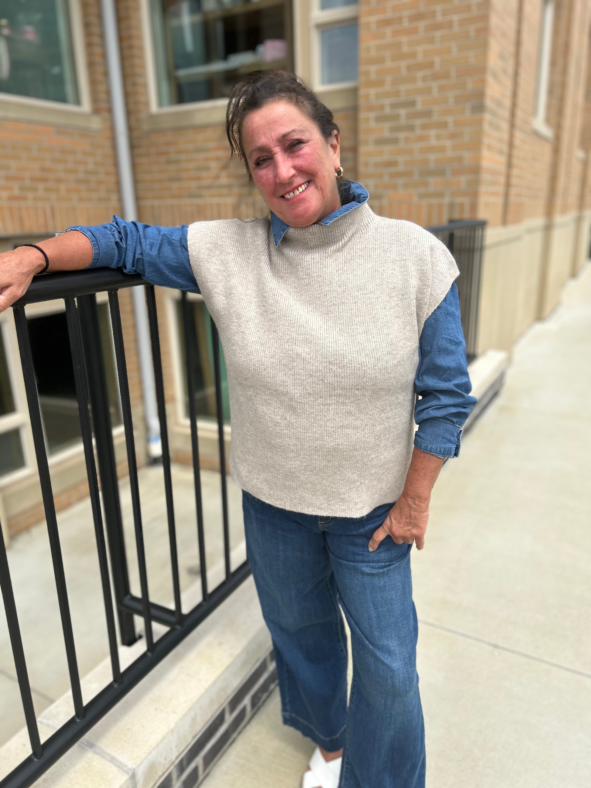 Mock neck drop shoulder topper. Wear alone or as a vest. Poly and spandex