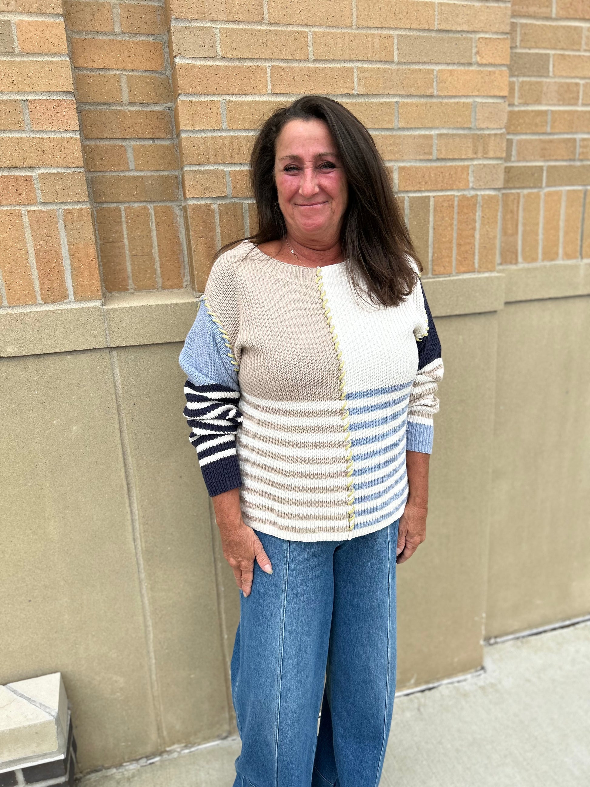 Multicolored sweater with loads of detail. Stripes and solid patterned with exposed knitted yarn at shoulders and down the front center. Banded sleeves and split hem. Boat neck collar and back center seam.