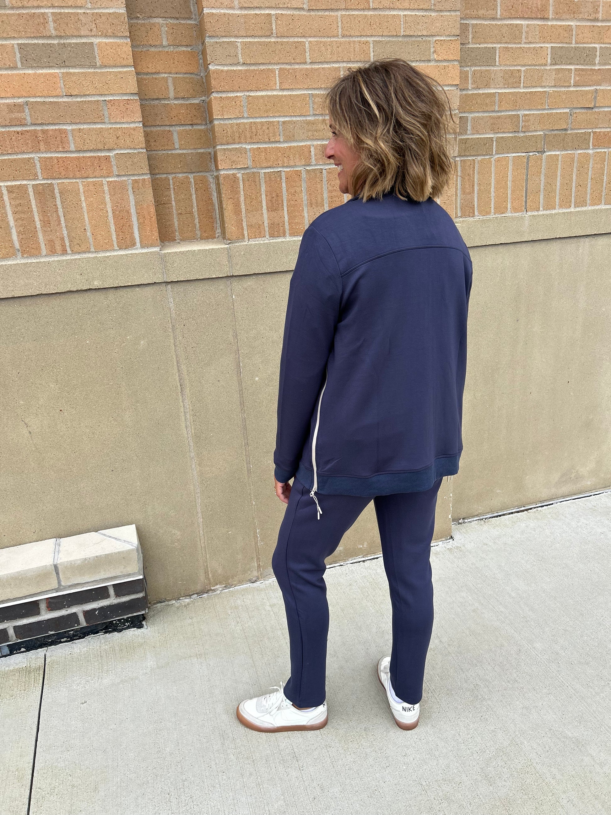 Elastic waist, slight narrow leg pant with slash, contrast front zipper pockets.