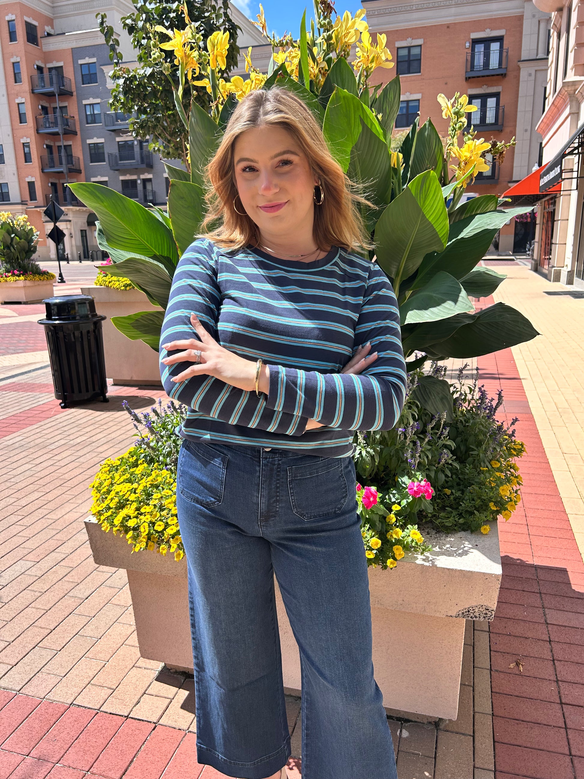 Step out in style in this long-sleeved, striped tee. Soft and comfortable fabric means you can be cozy and oh so stylish all at once! Perfect on its own or layered under a denim jacket, this versatile look is a Fall Must Have!
