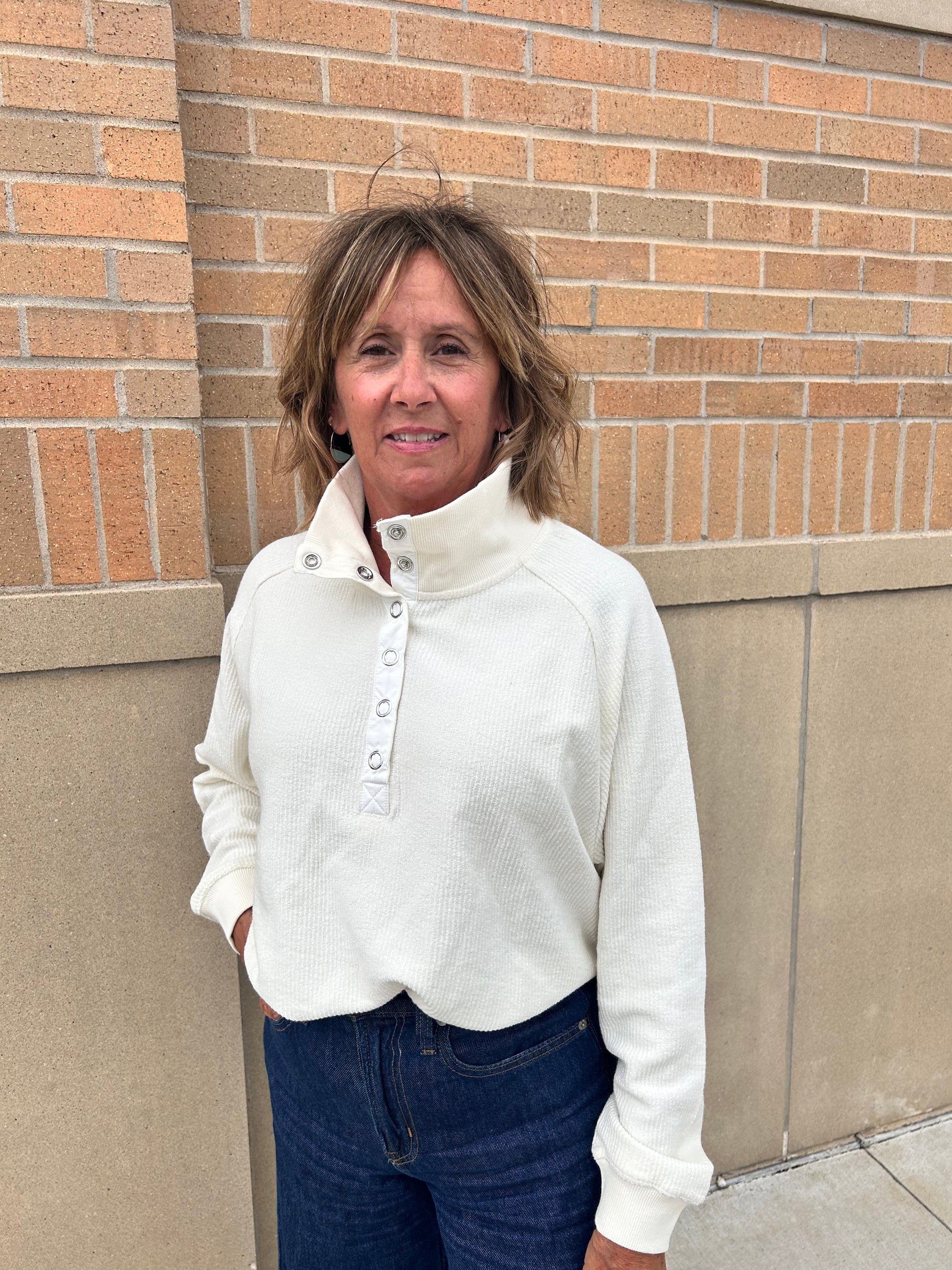Tall, funnel neck collar with 1/4 snap front. Shirt tail hem and banded sleeves. Soft, ribbed fabric.