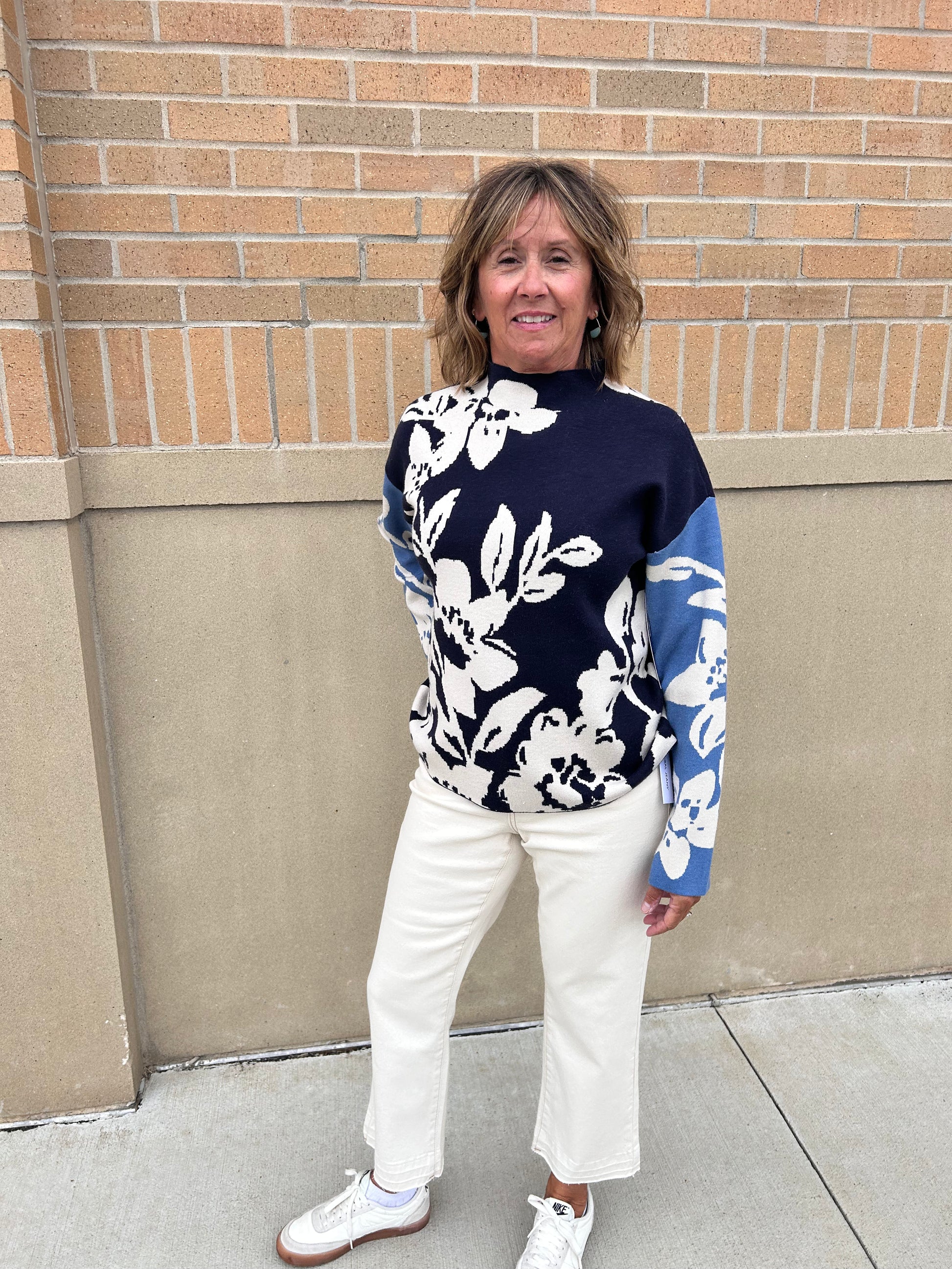 Funnel neck style top with colorful blue flower pattern. Straight hem and cuffs.