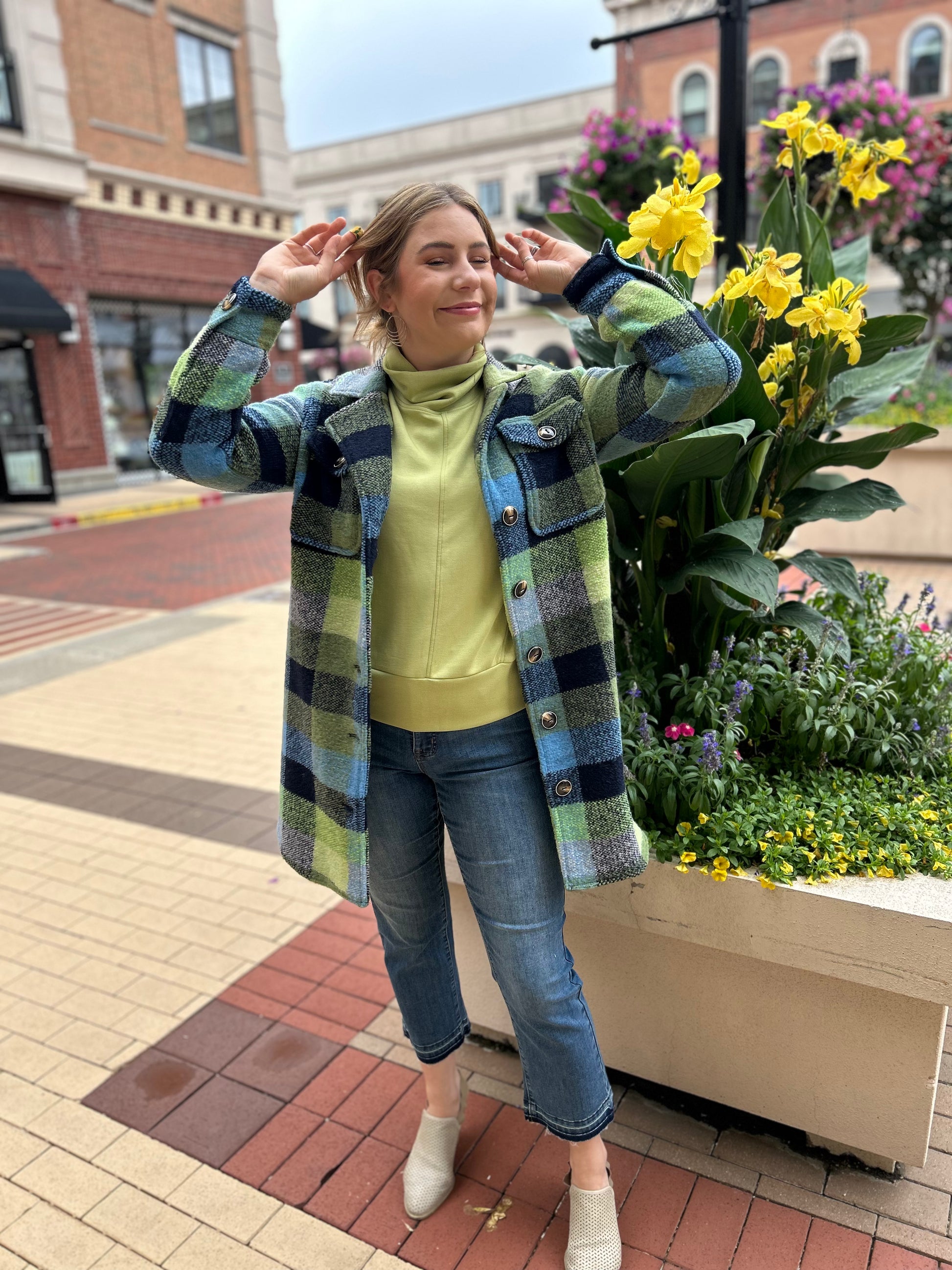 Transform your look with this classic knit shacket, featuring a bold plaid pattern and distinctive novelty buttons. The long silhouette offers ample coverage, keeping you cozy as the weather cools, while the notched lapels add a touch of refined detail, effortlessly enhancing your ensemble with understated elegance.