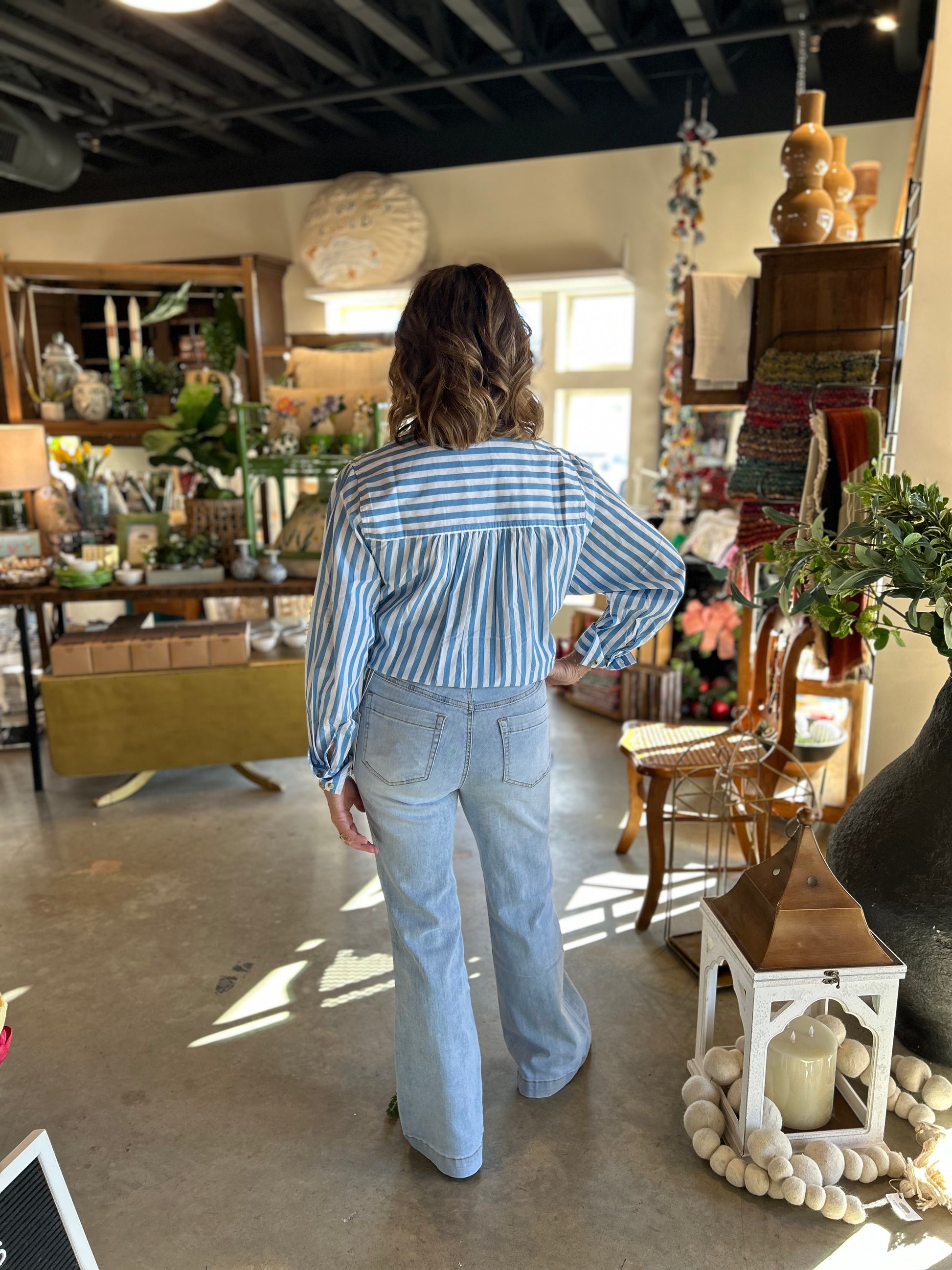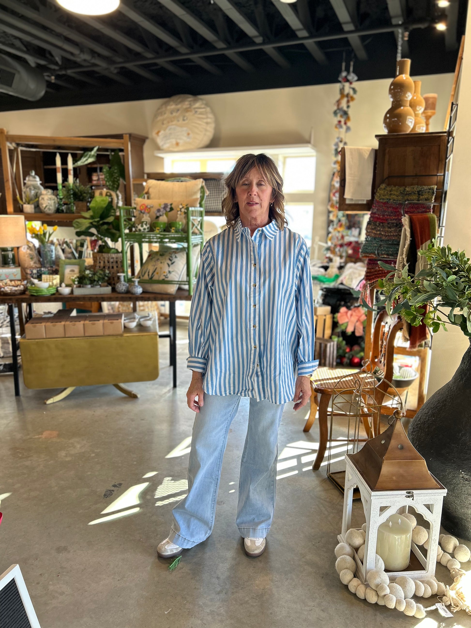 Classic style striped shirt with long hem, to be worn untucked, tucked or tied. Gathers at back shoulder seam.