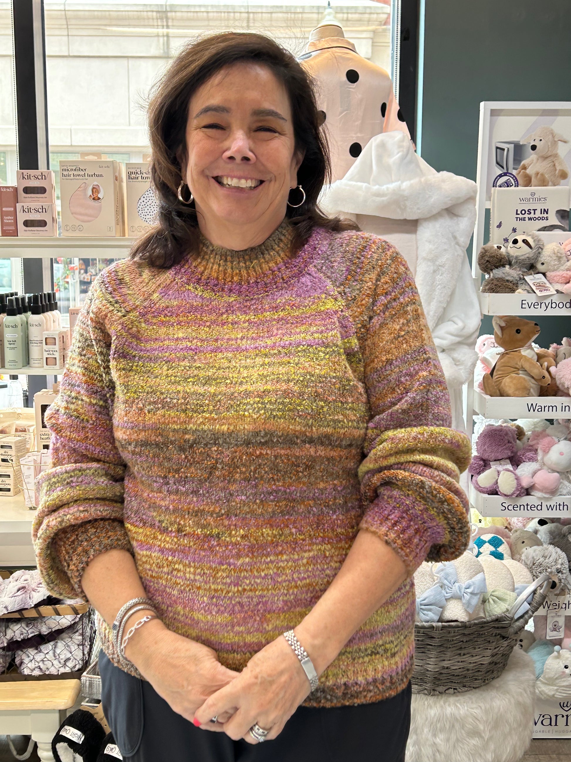 Fall color horizontal stripes, mock neck styling. Soft, lightweight, polyester/wool blend.