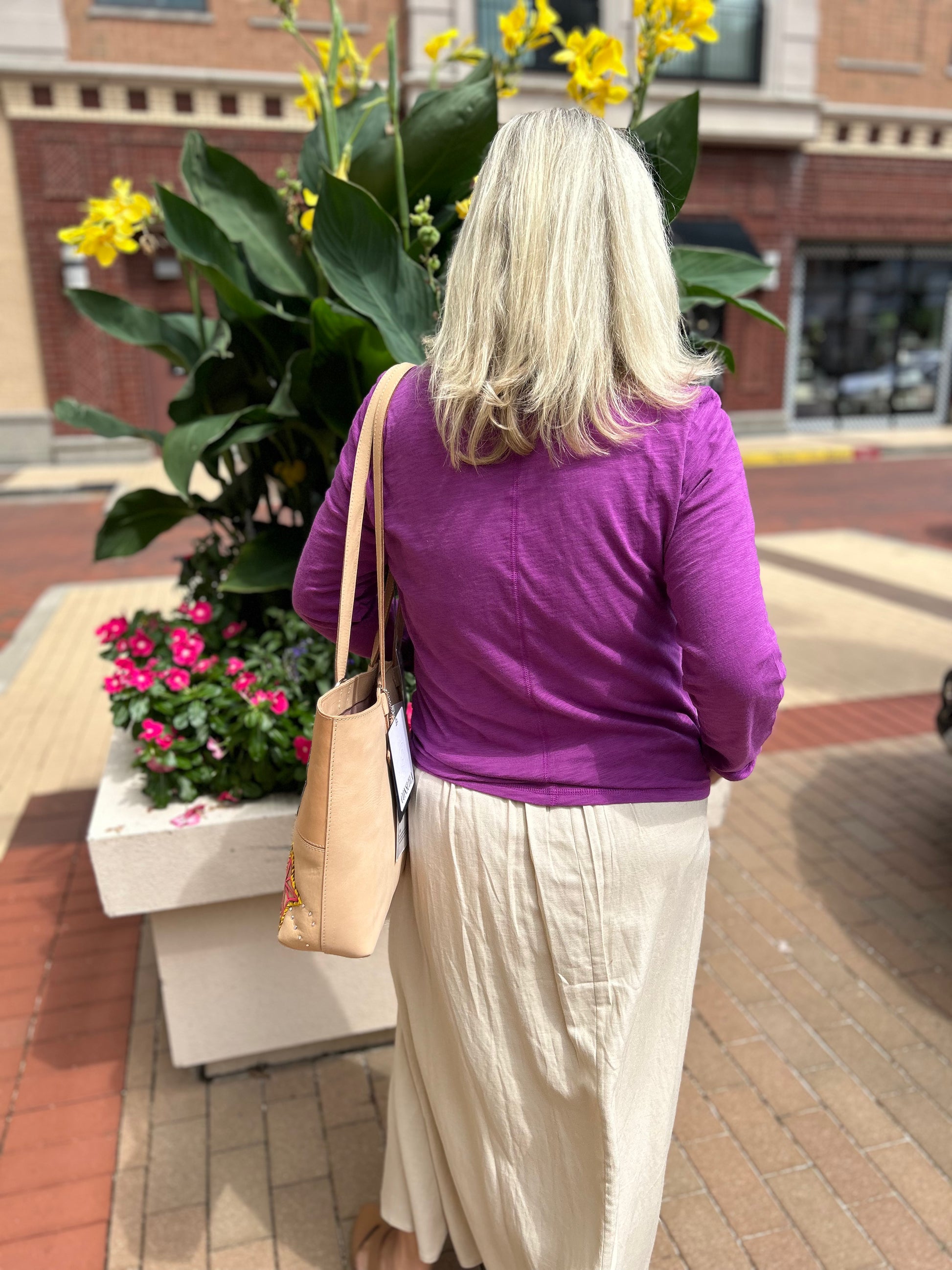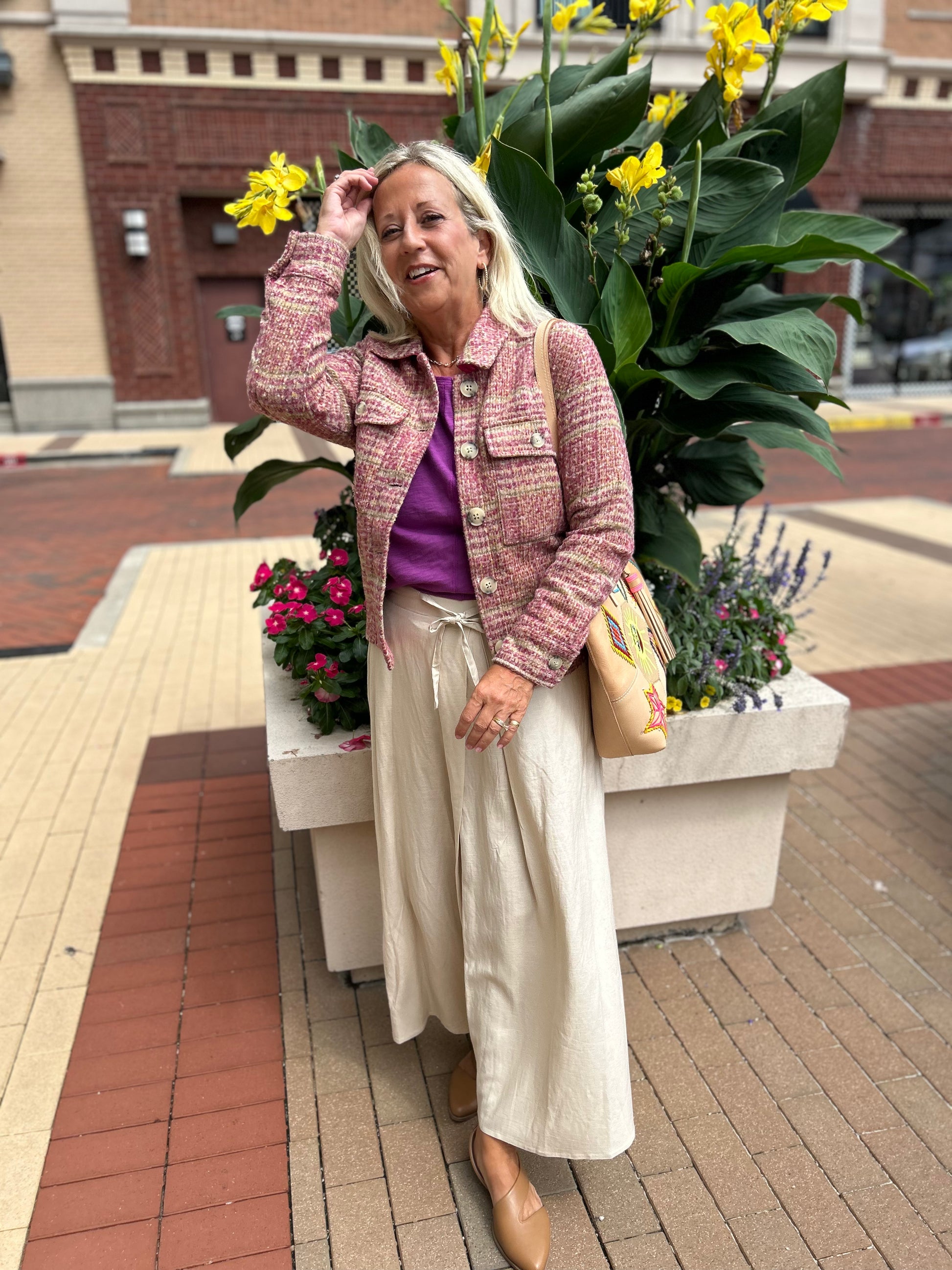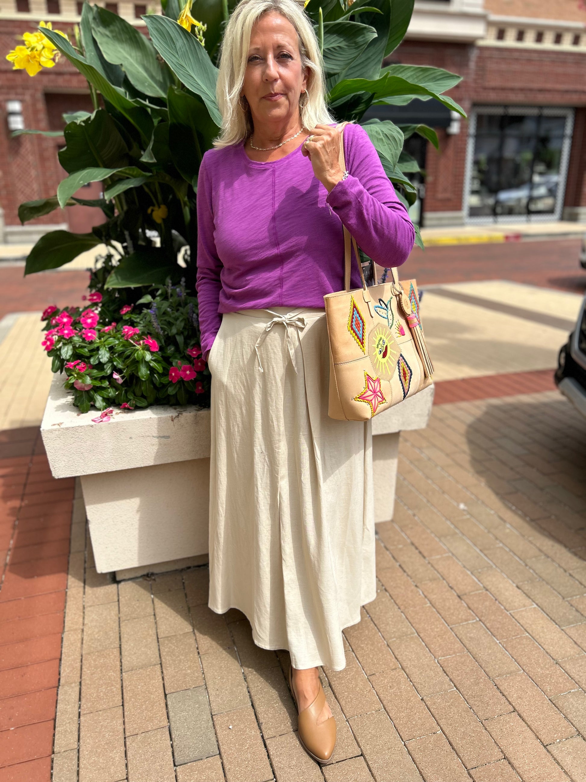 Linen maxi skirt has elastic waist with drawstring. Double pockets!