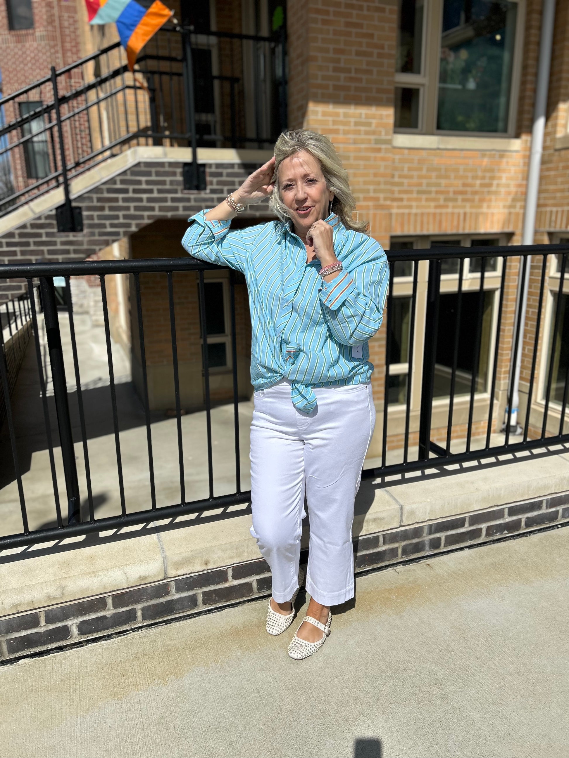 Colorful blouse with collar and button front. Contrasting fabric inside entire shirt. Front chest pocket. 100% cotton.