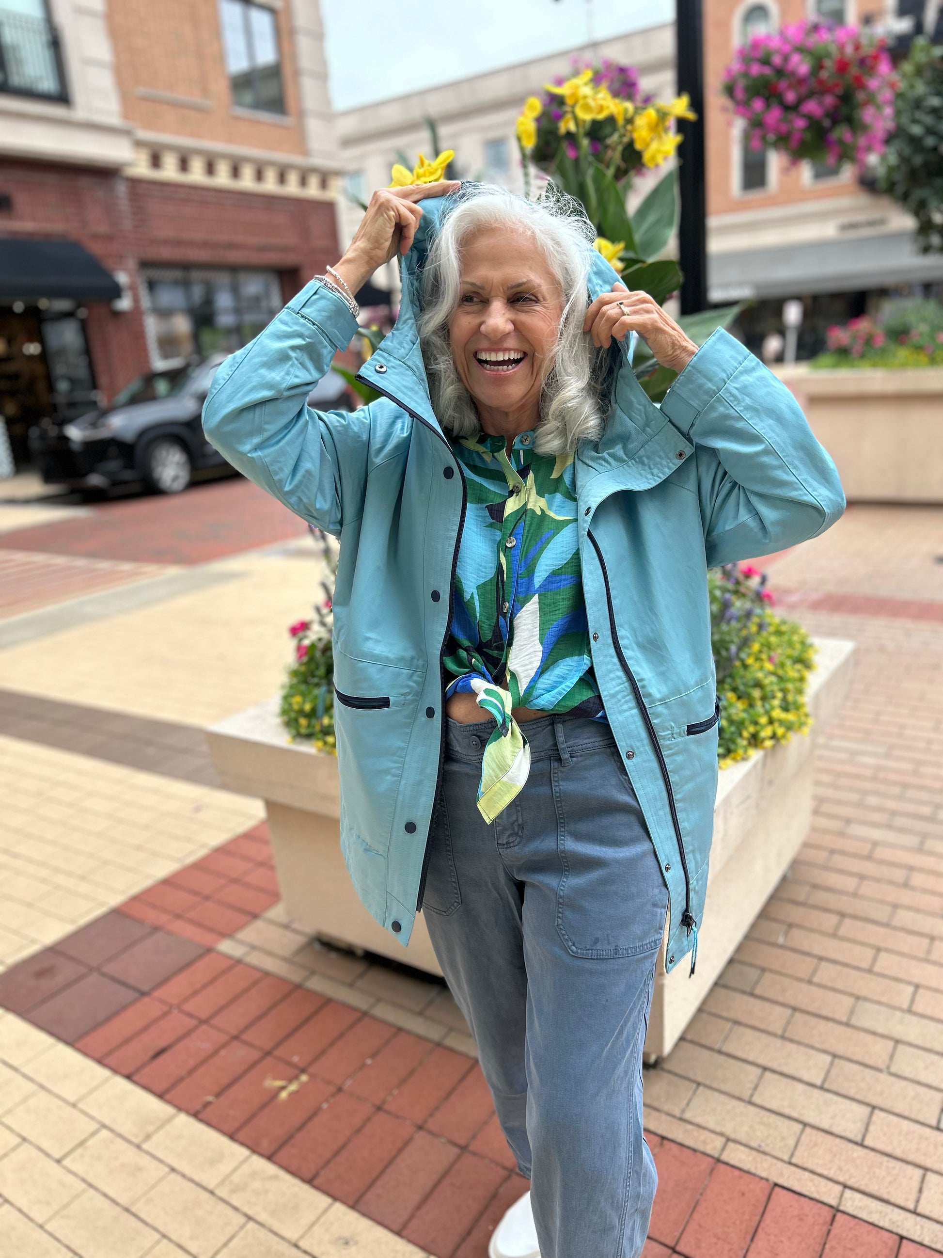 Stay dry in this trendy raincoat! Featuring a misty blue hue with sleek black zipper accents, this water resistant jacket is perfect for everyday adventures or travel!