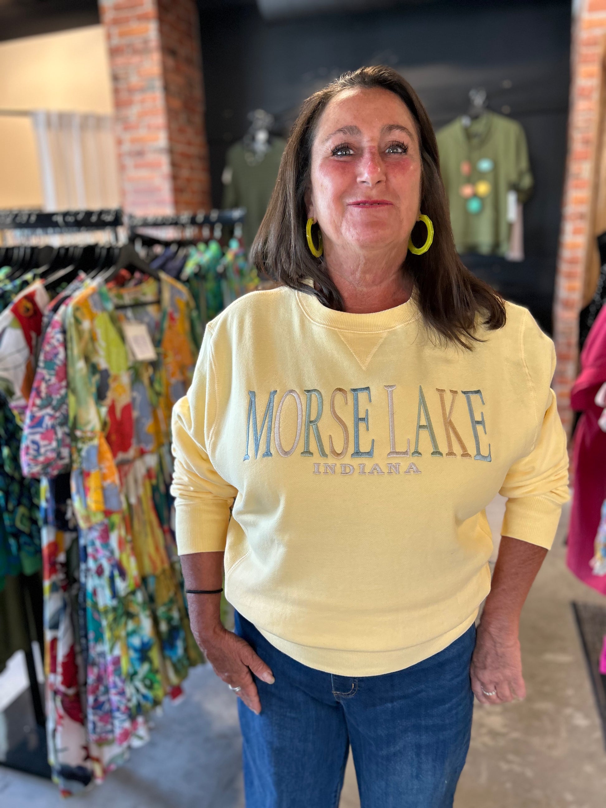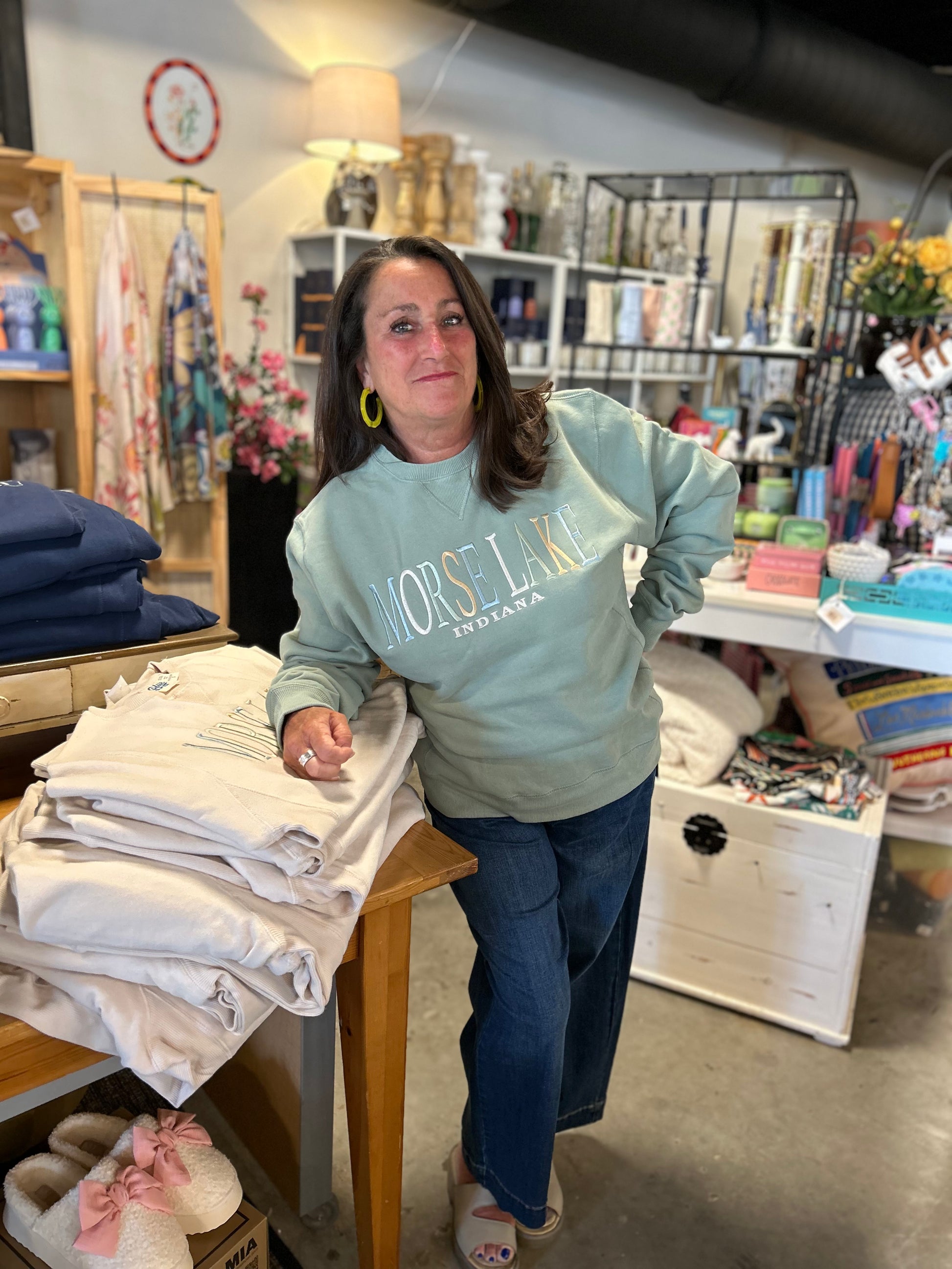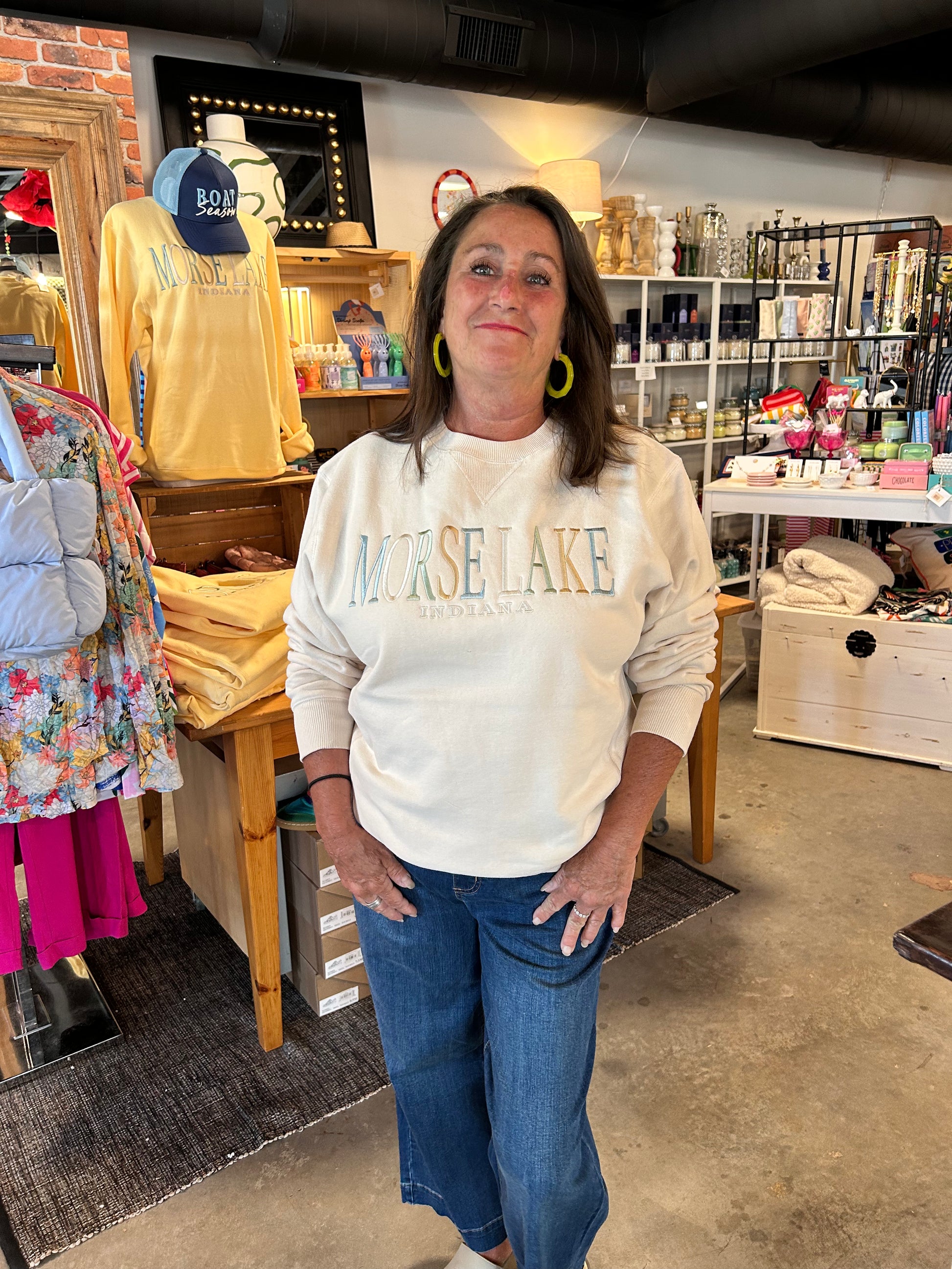 Unisex fit 80% cotton personalized crew neck sweatshirt. Stretchy ribbed panel on the sides for extra comfort. Model is wearing a medium.