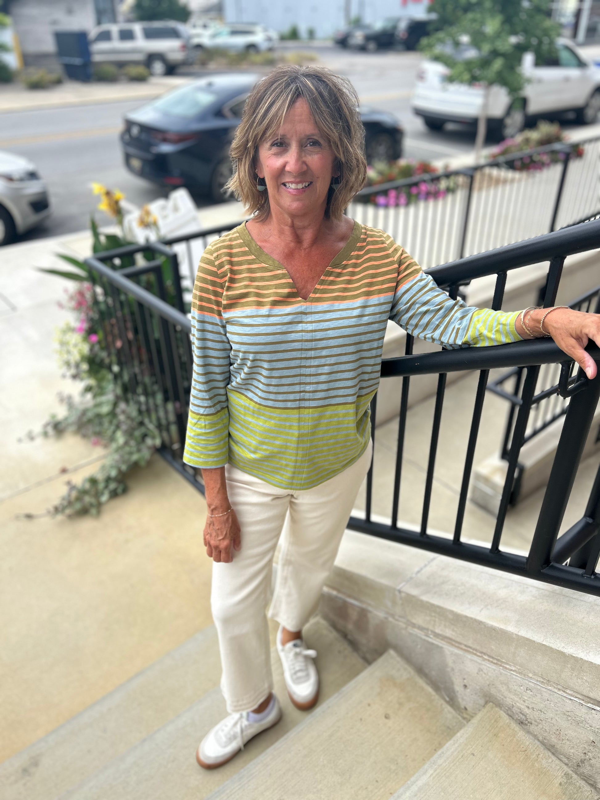 Multi-striped tshirt with v-neck. 3/4 sleeves. Longer length with middle seam on front and back.